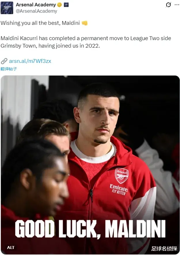 官方:阿森纳宣布马尔蒂尼-卡库里转会加盟了英乙球队格里姆斯比。