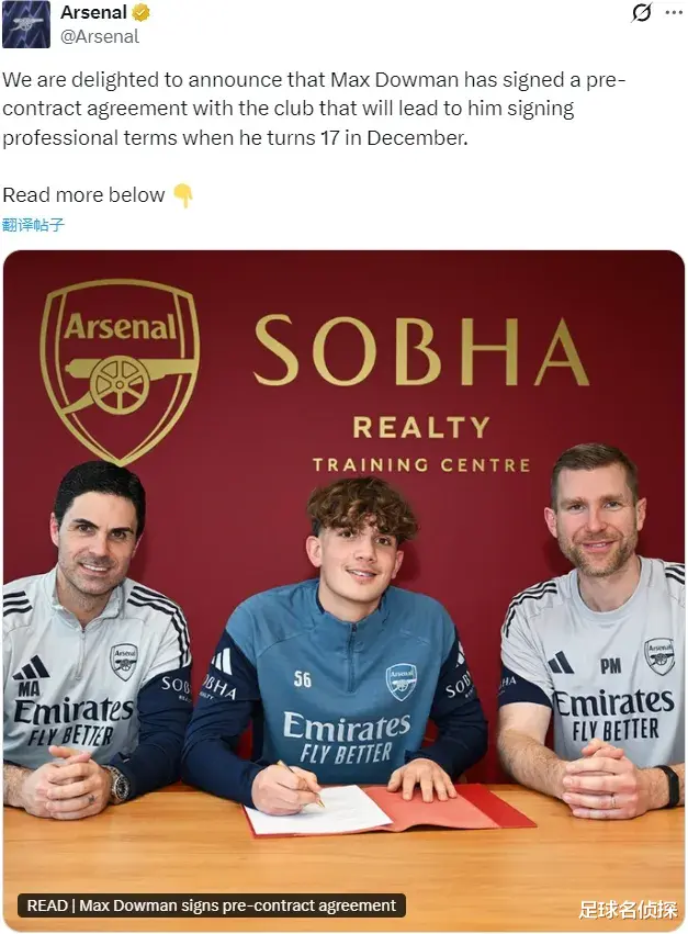 官方:阿森纳宣布和道曼预签了协议,这名神童将在今年12月年满17周岁后和球队直接签下职业合同。
