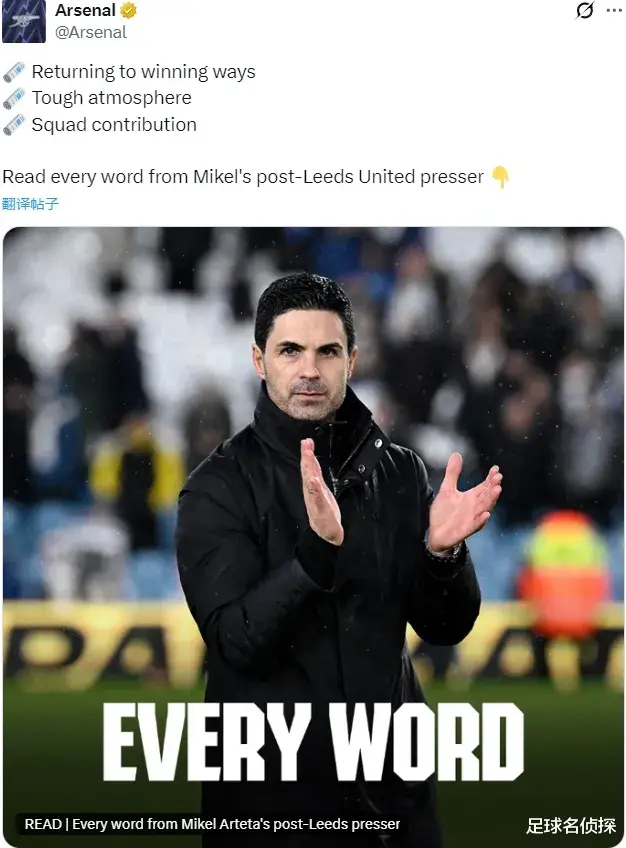 阿尔特塔出席了赛后新闻发布会,我们来看阿森纳主帅的发言。