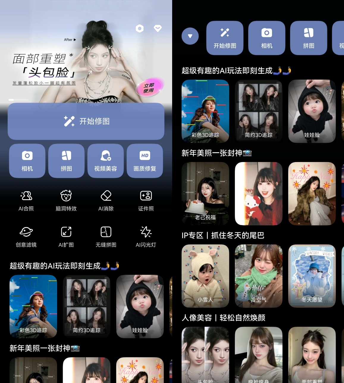 鸿蒙版美图秀秀的变化也是令人佩服,不仅给我的脸美颜了,它自己也“美颜”了——从一年前残缺的“试运行版本”,到现在的版本,简直是把我往“穿搭博主”方向培养的程度!首页里,AI合照、AI消除、脑洞特效、画质修复、创意滤镜等都有,而且更新节奏明显快了,总有新玩法、新惊喜~