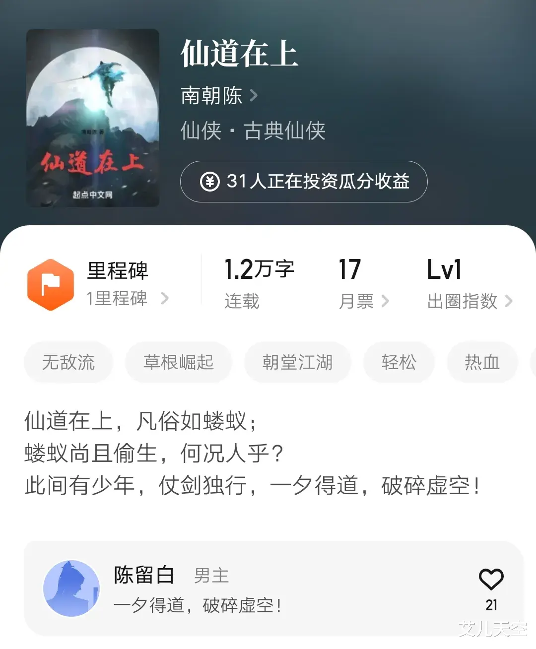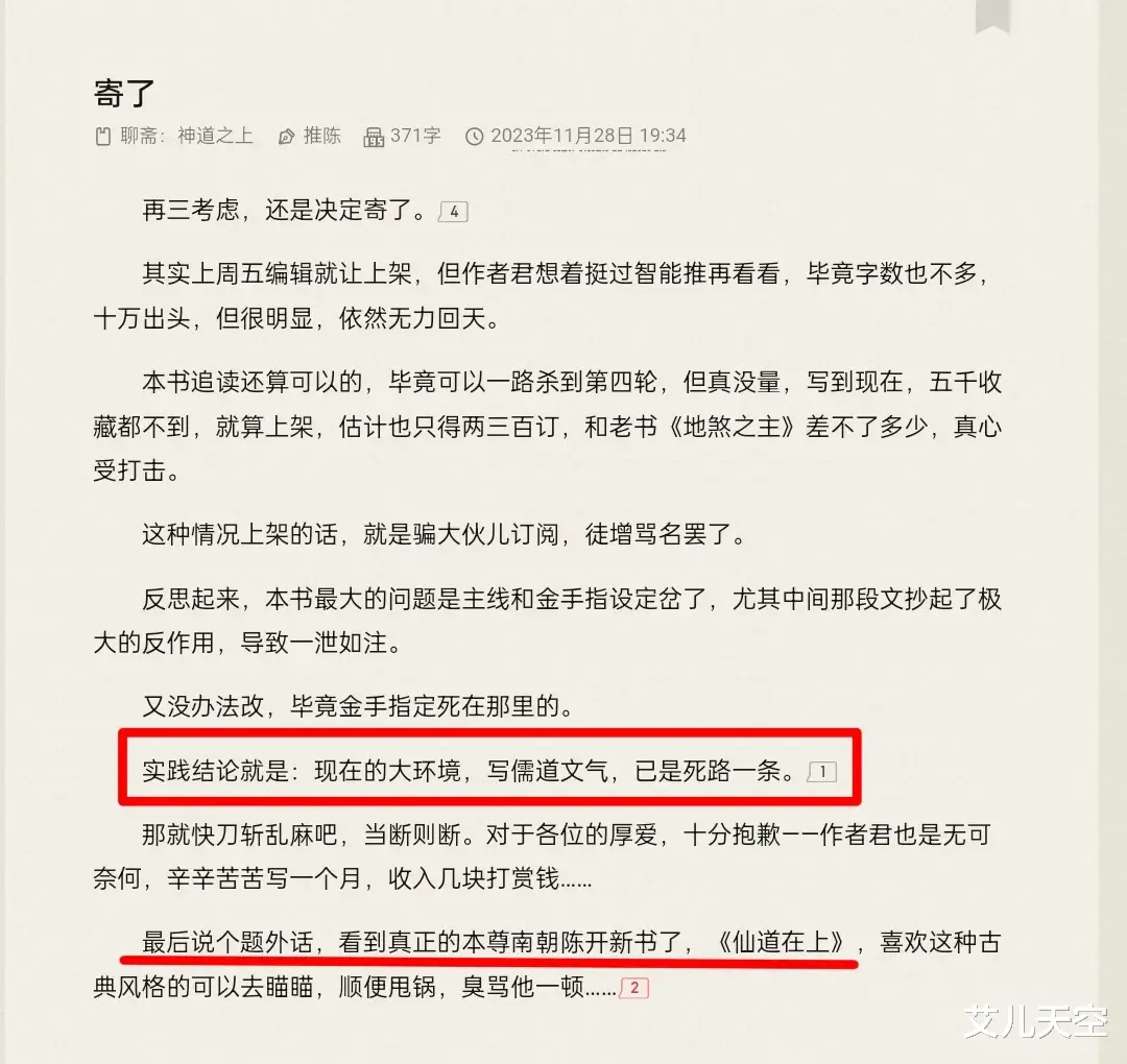 南朝陈这几年创作虽然没停,但确实没怎么出成绩,去年三月的时候这个大神账号还试着开过一本文娱小说《顶流人生从扑街开始》,只是也没写多久。