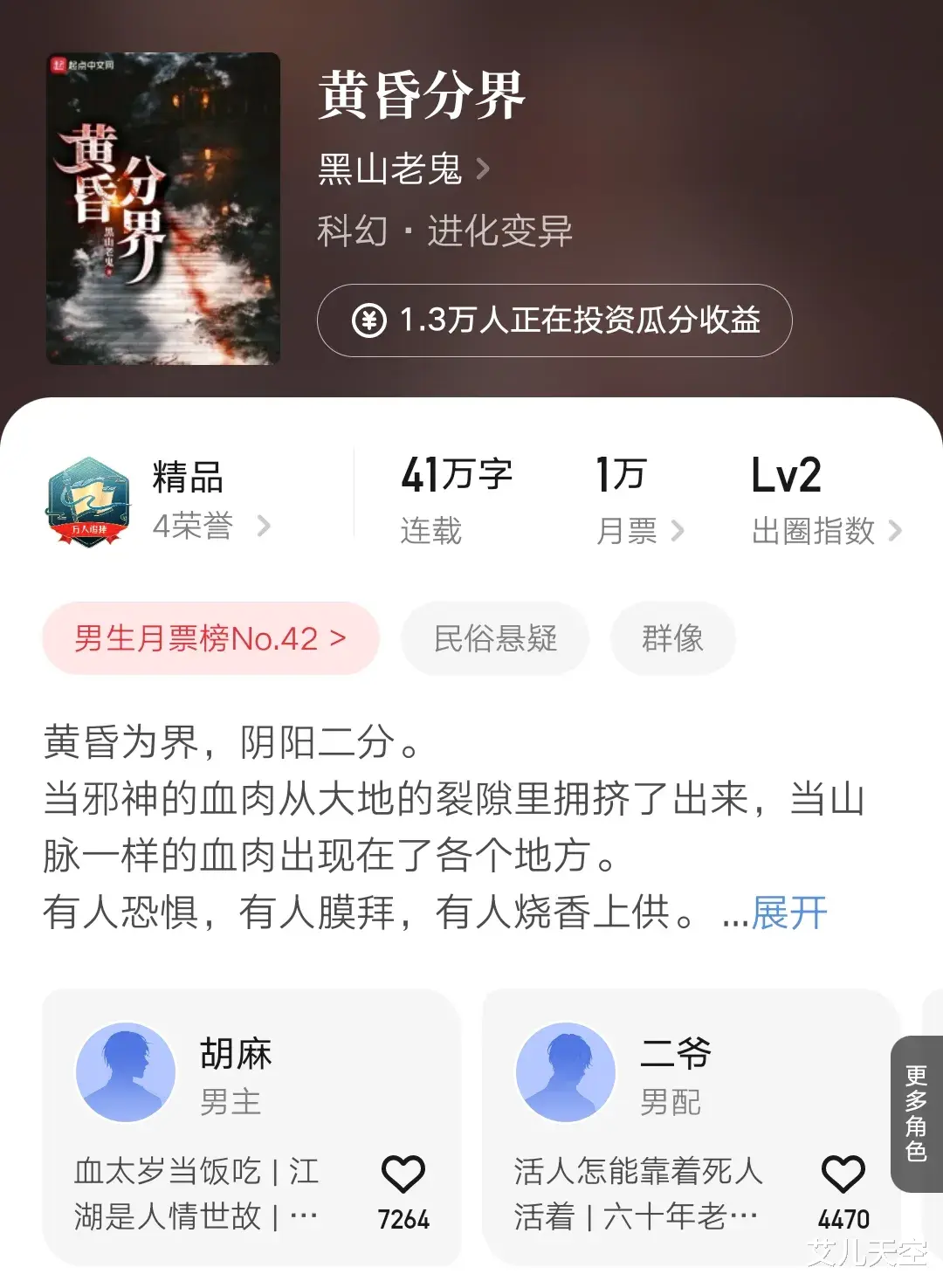 等到这本《黄昏分界》,开始写东方民俗故事了,口碑反而开始回升了。小说成绩目前看着三万均订左右,起步已经仅次红月了。而他在民俗文里又加入了群穿转生者的元素,有兴趣的可以去试试。