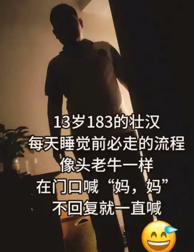她的儿子今年才13岁,也已经长到一米八三了,身上的校服是去年才买的,也已经不咋合身了,可就是这么个壮汉,每天晚上睡觉前都要像头老牛一样喊着“妈妈”。