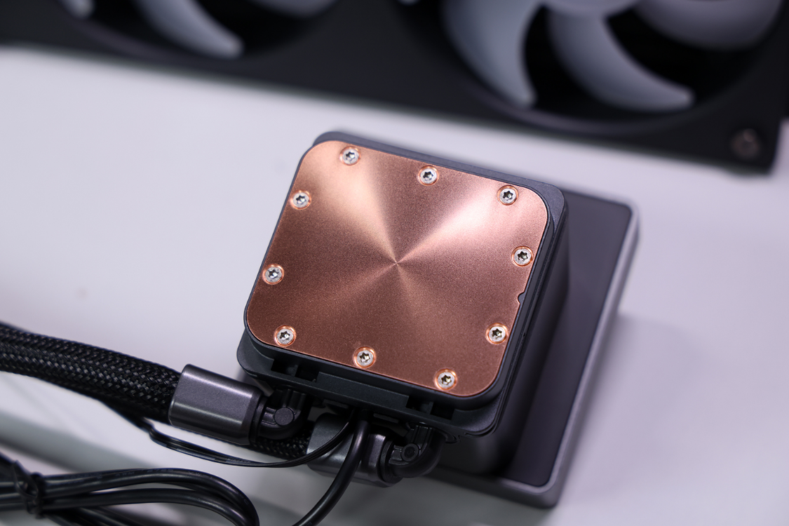 水冷采用方形冷头外形,冷头底部配备了一块大面积纯铜底座,可以完全覆盖AMD与Intel绝大多数处理器的顶盖。而冷头内部内置的高扬程水泵,则最高可达2700±10% RPM的转速,可以快速将CPU产生的热量传入冷排中。
