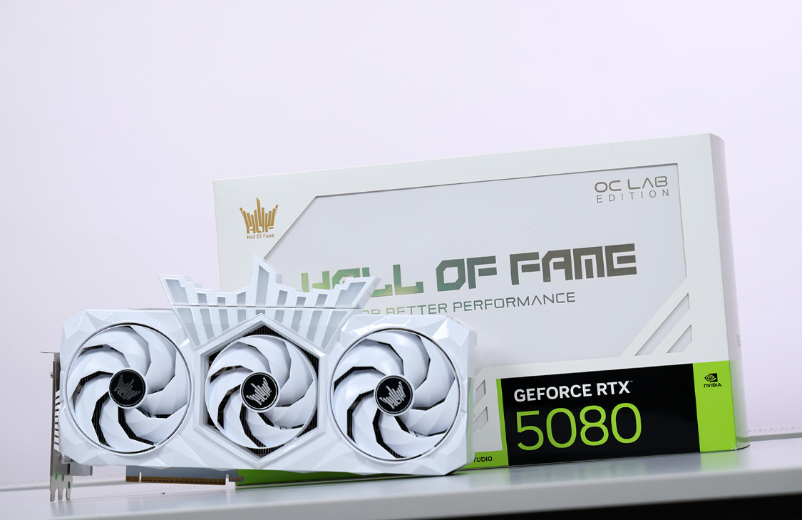 全白配色的显卡本体,钻石切割造型散热外壳,质感优秀。3颗白色无光霜环风扇(左右102mm+中间92mm)设计,同时中间风扇边缘及顶部灯带,搭配同样搭载ARGB灯效的皇冠设计,信仰拉满。显卡背板两端也有两个对称的皇冠造型,构成贯穿风道的背部开孔也成为了造型的一部分,设计感拉满。代表六边形全能战士的HOF LOGO灯元素位于金属背板中心,辨识度直接拉满。