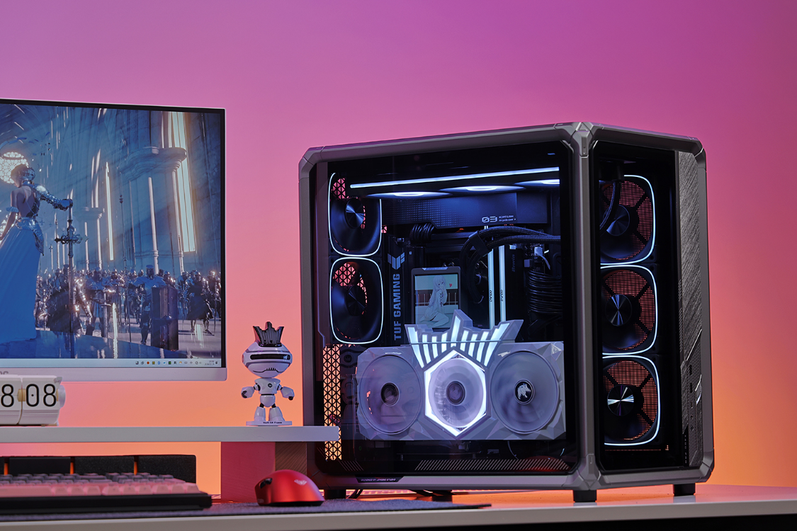 机箱左侧与机箱前脸均为暗化处理过的钢化玻璃面板,可以让机箱内部硬件的灯效看起来更加柔和,玩家也可以透过面板实时观察到机箱内部硬件的运行状态。机箱其余的金属面板表面均设计了大面积散热网孔,可以与机箱内部的散热风扇构成十分高效的散热风道,避免机箱内部出现积热。细密的散热网孔也可以在保证机箱散热效率的同时,避免虫子等异物进入机箱。