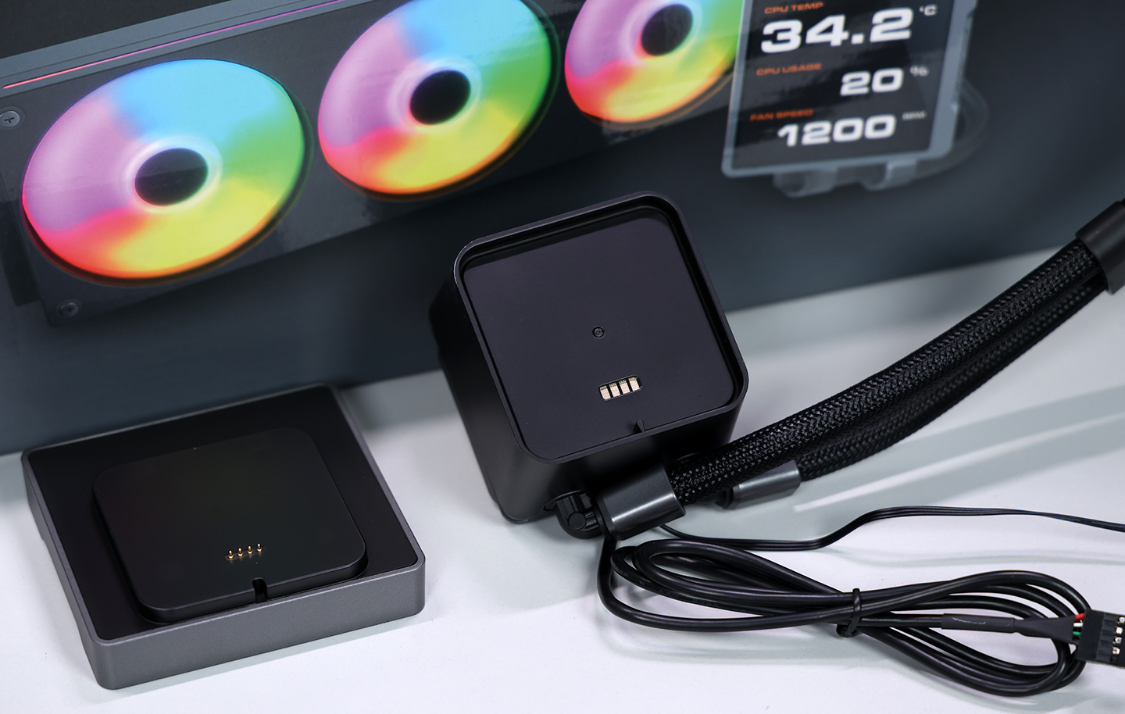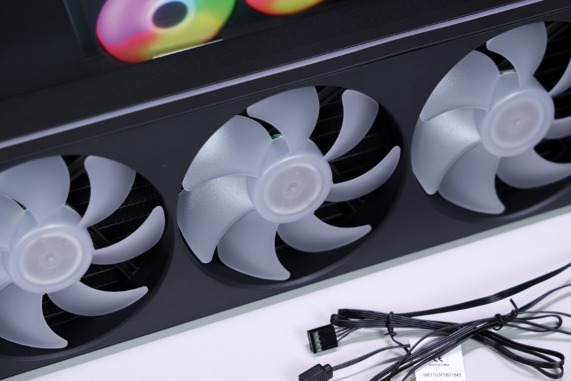水冷标配一套120mm规格的三联排型黑色ARGB散热风扇,风扇型号Unity 360 ARGB,整套风扇采用一体式结构和一线通设计,且风扇出场便已经预装至冷排上。