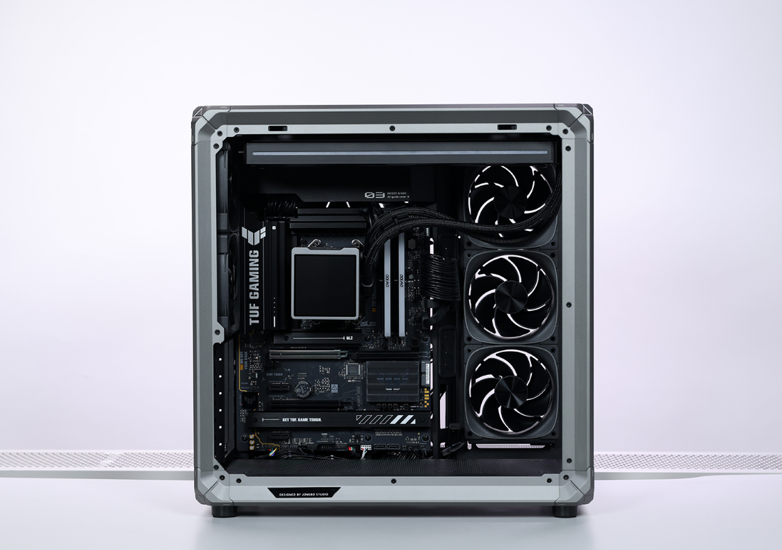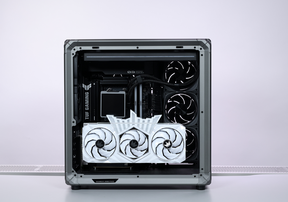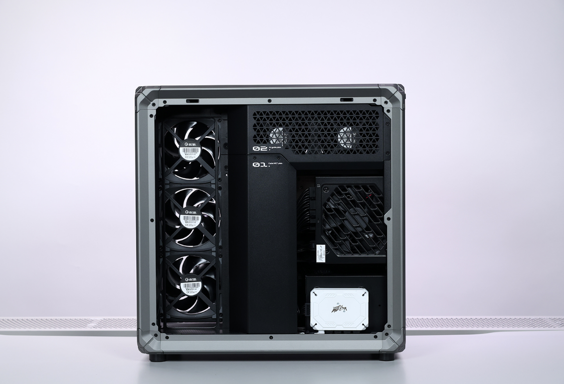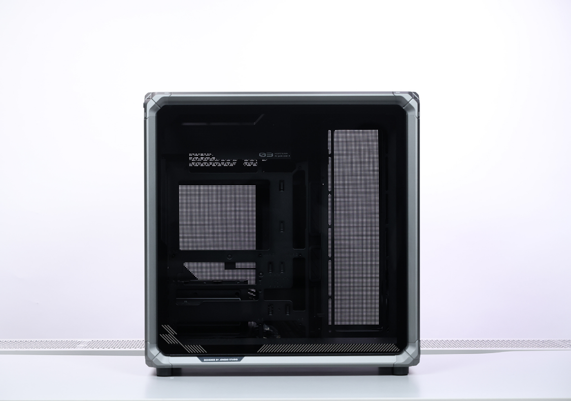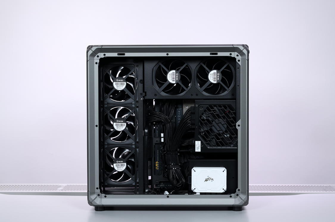 取下所有面板,机箱内部空间宽敞,最大支持安装ATX规格主板,也支持安装背插型ATX规格主板。机箱支持安装长度不超过427mm的大体积显卡,主板托板的右下角还提供了一颗可调节高度的显卡支架,7个PCIe插槽也让机箱有了十分充足的拓展能力,可以兼容安装更多PCIe拓展设备。散热方面,机箱内部设计了大量散热风扇位置,并且在主板安装位的上方与背部配备了气流导风板与散热风扇安装位,整个机箱最多可同时安装13把120mm散热风扇,并支持安装高度不超过176mm的风冷,也支持顶置或侧置安装360规格水冷;