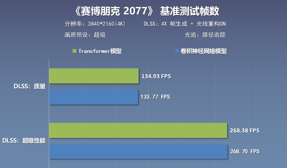 《赛博朋克2077》基准测试,将画质设为超级,光追设为路径追踪模式,开启DLSS 4.0和光线重构,并将多帧生成倍率设为4X,4K分辨率下,游戏在DLSS质量和超级性能档位下的游戏帧数如图。