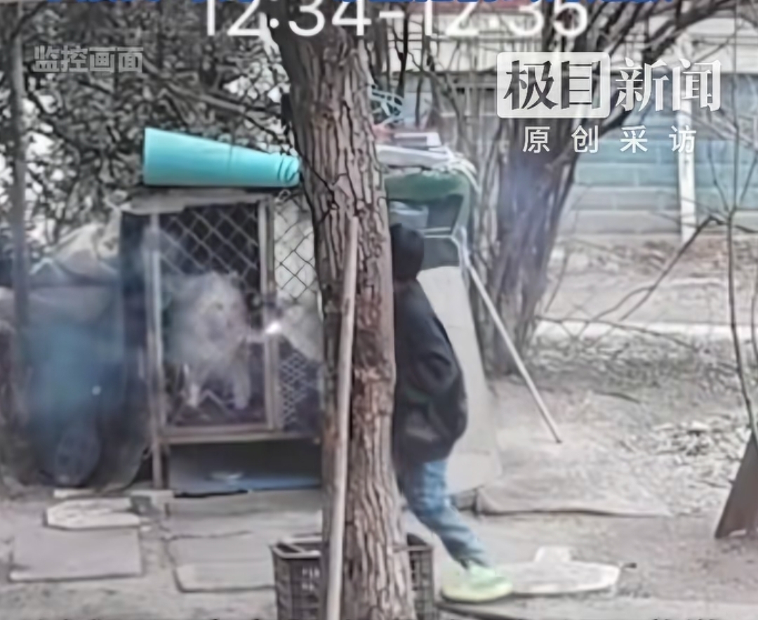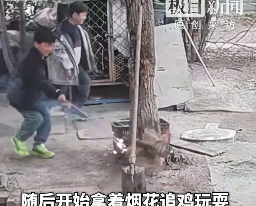 那位穿着黑衣服的孩子,拿着烟花追着院子里的动物,不停的用火花烧这些动物。