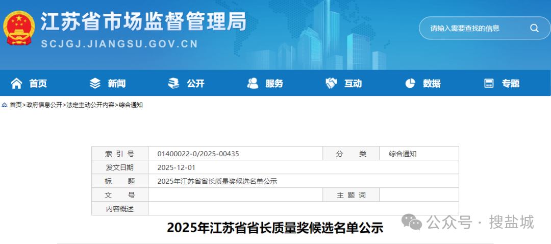 12月1日,江苏省质量发展委员会办公室发布“2025年江苏省省长质量奖候选名单公示”。