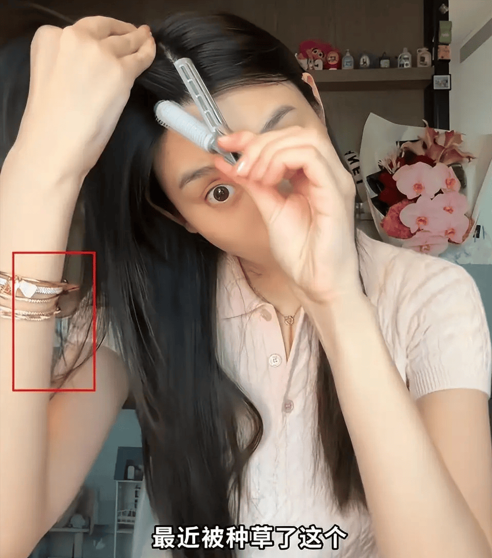 从这个角度看,奚梦瑶的眼睛很大、下巴很尖,有一种两腮无肉的感觉,显得她特别瘦。值得一提的是奚梦瑶手上戴了5条奢侈品手链,真的是闪耀又贵气。