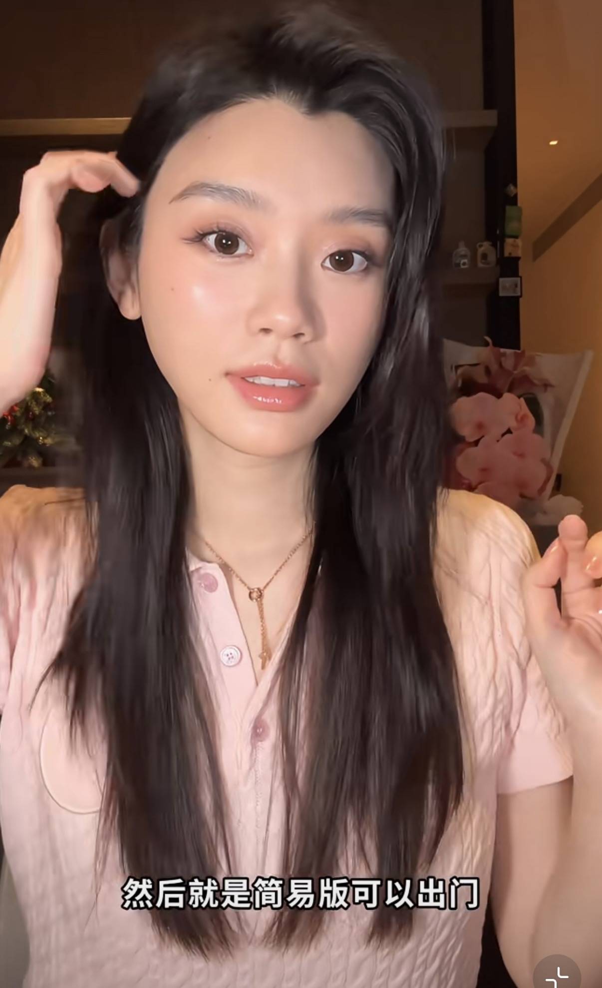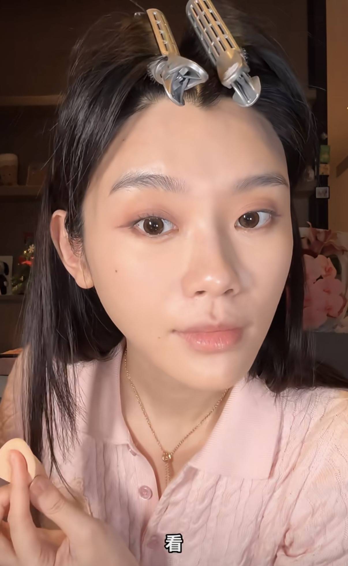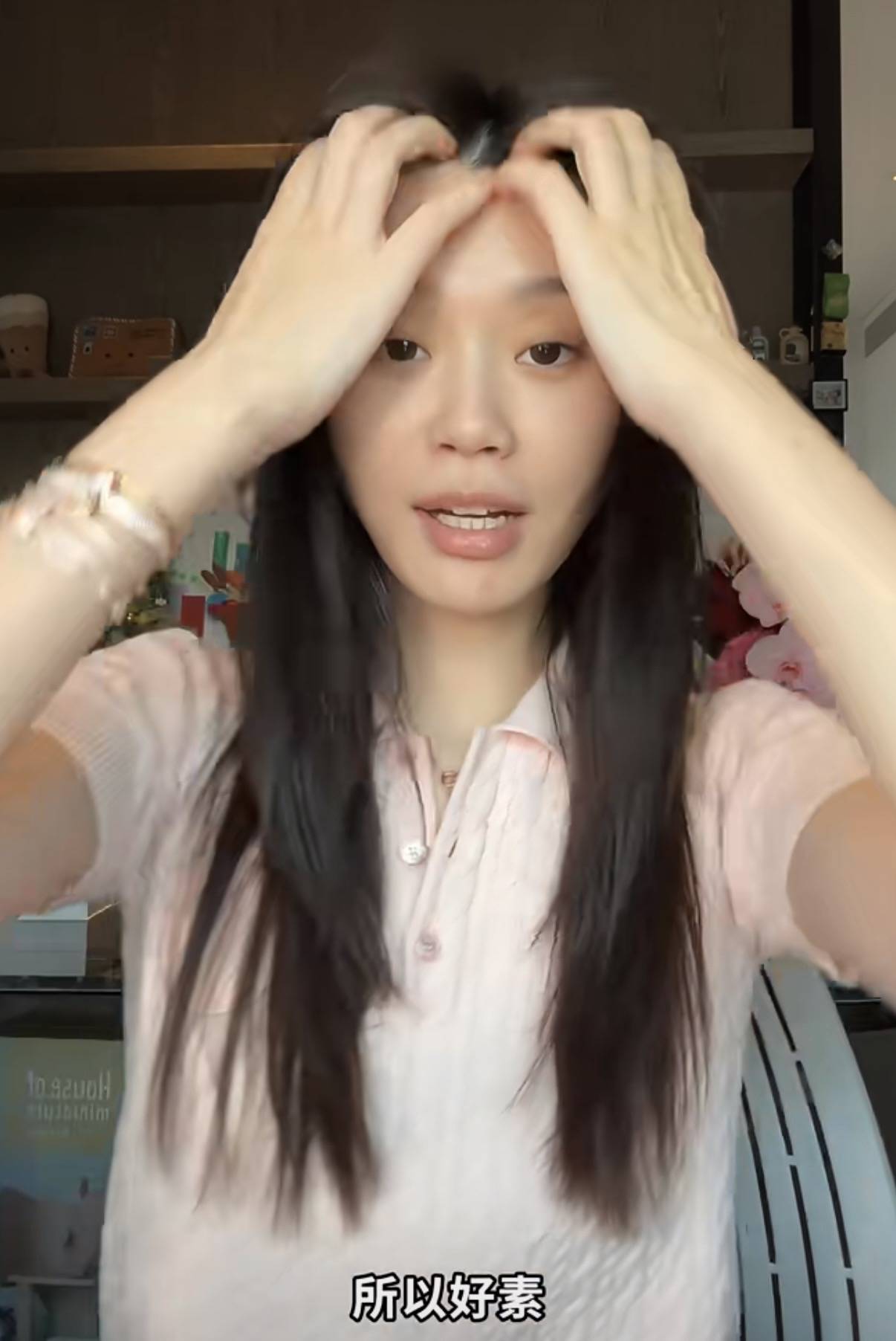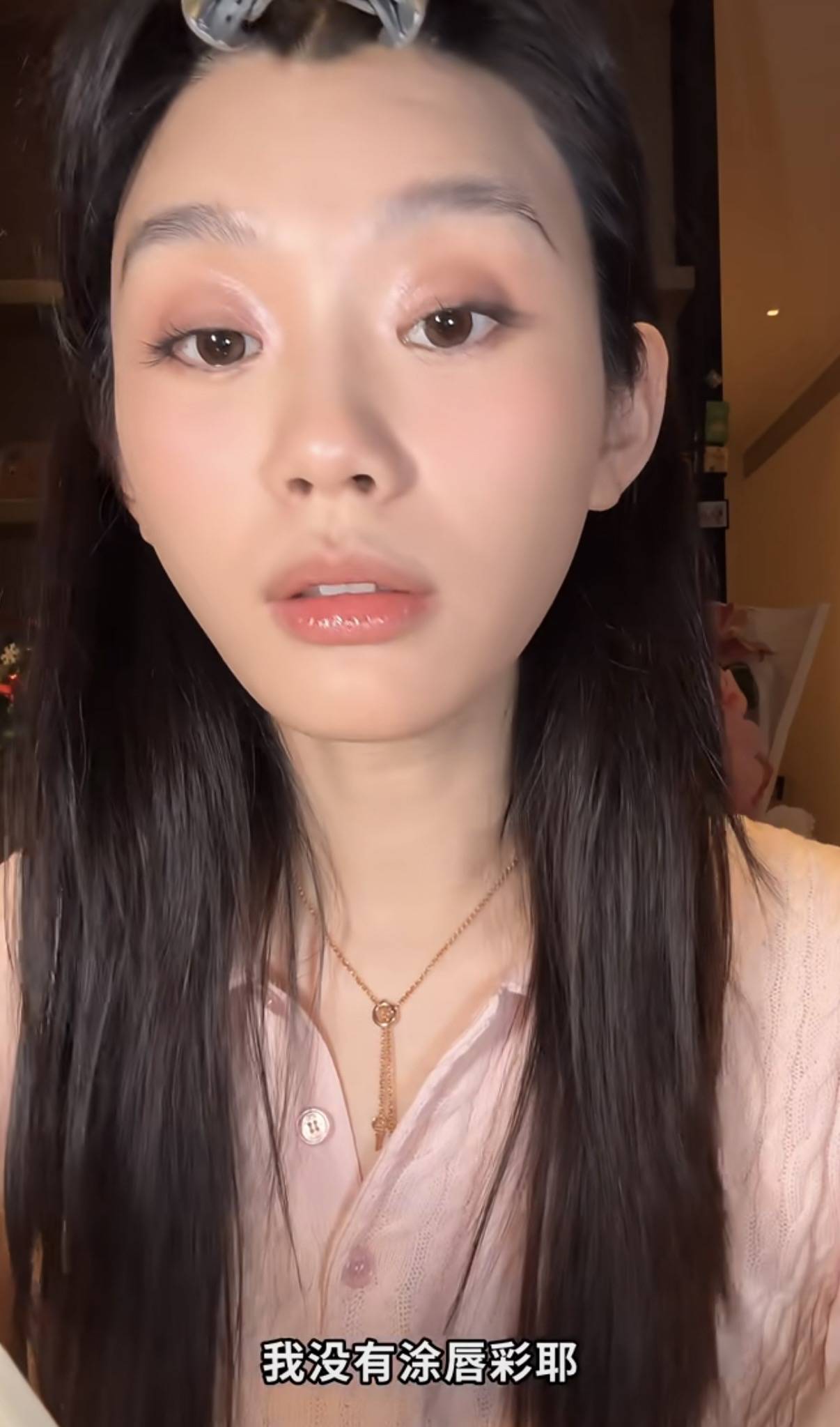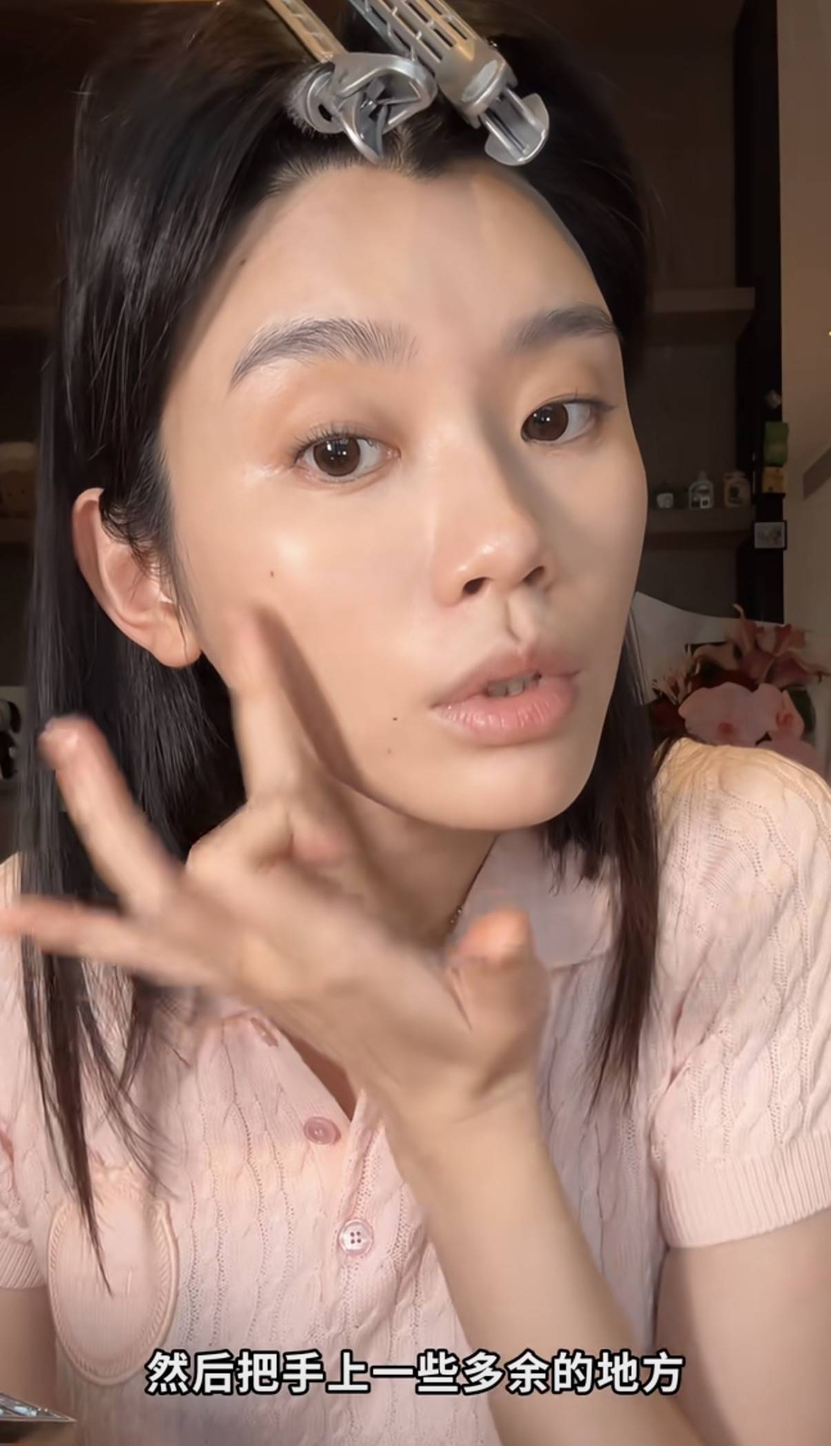 既然是化妆视频,自然是从素颜状态开始。奚梦瑶素颜的状态很真实,她的手和脸完全是2个颜色,脸部皮肤更暗一些。