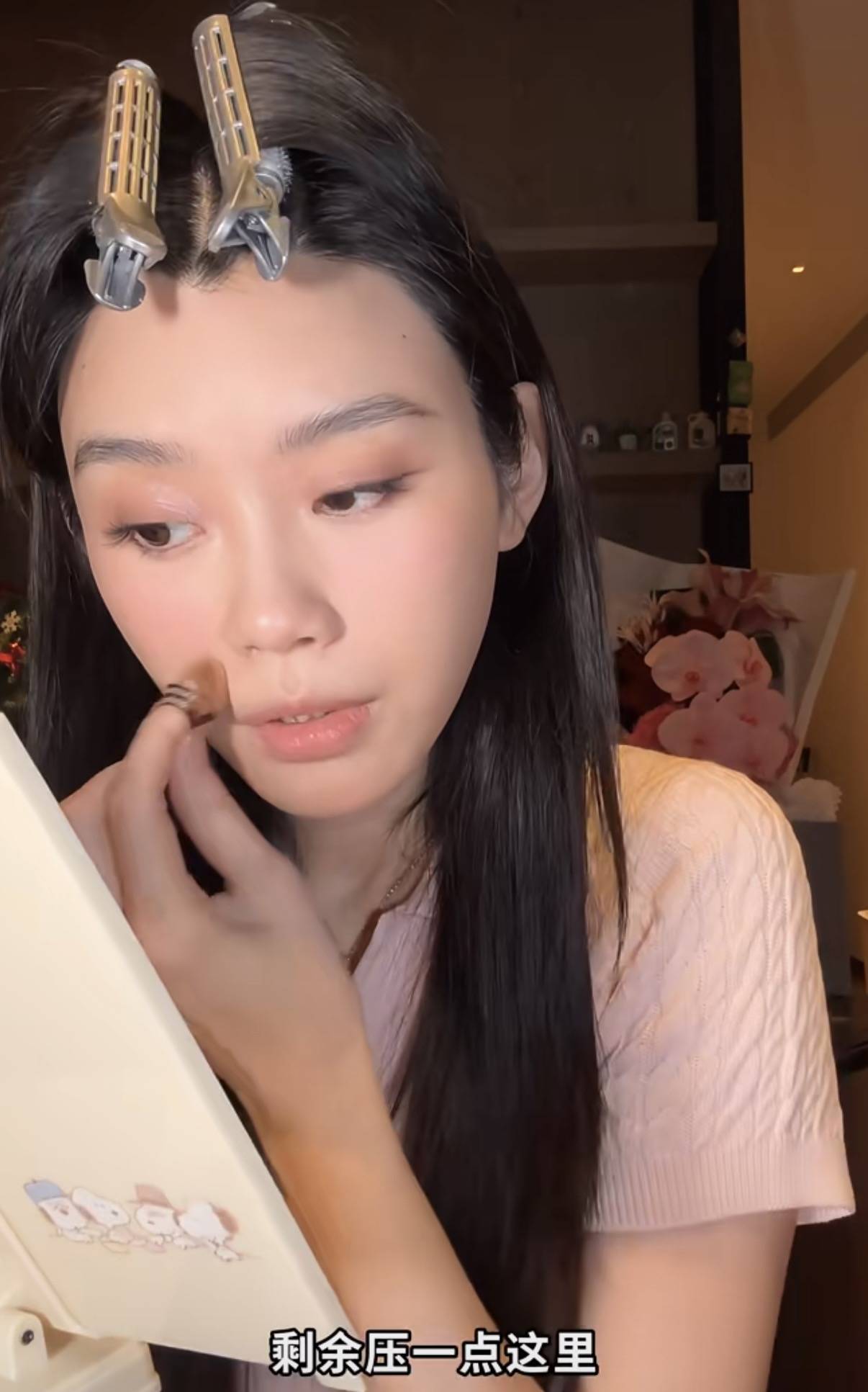化妆的第一步,就是上粉底。奚梦瑶习惯用手直接上粉底,而不是用粉扑。其实直接用手上妆效果更服帖,也不会吃粉,主要是还特别方便。