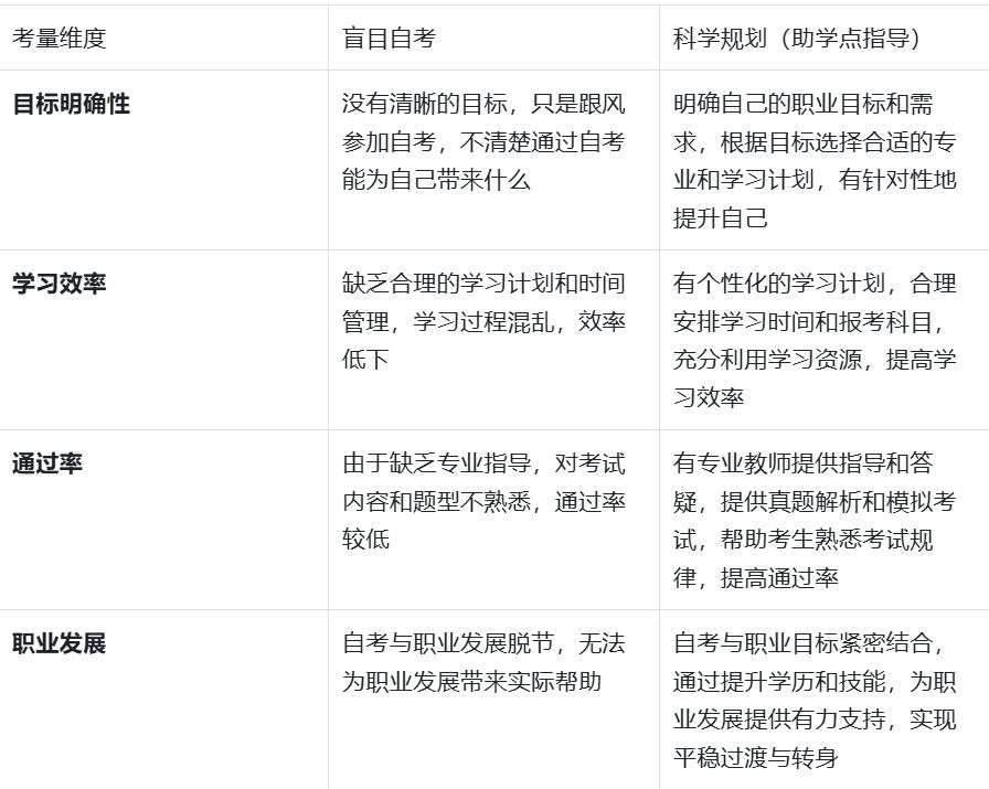 行动建议:考生可以列出自己的职业现状和期望目标,分析两者之间的差距,思考通过自考弥补这些差距的具体途径。