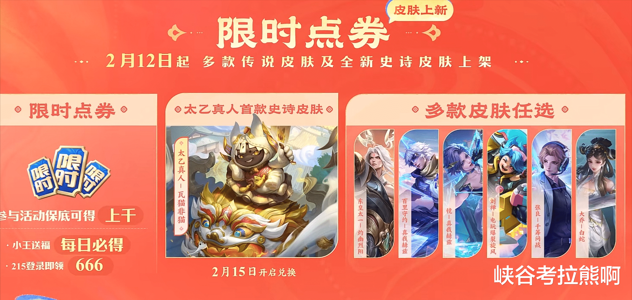 2月15日,太乙真人全新史诗皮肤【瓦猫非猫】也将加入点券商城开启兑换,只要认真做任务收集点券,这款皮肤相当于免费。