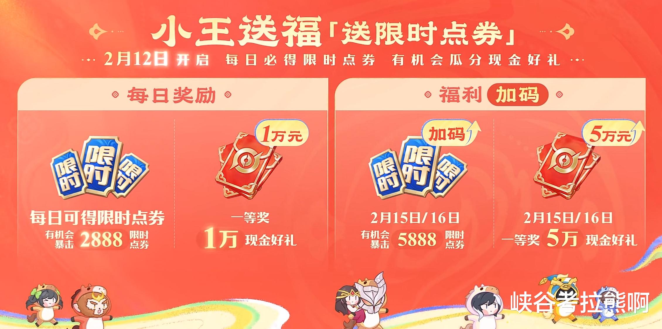 小王送福属于限时点券福利升级活动,2月12日起除了每日保底的限时点券收益之外,还有机会暴击获取额外点券,最高有机会拿到2888限时点券。2月15日到16日有机会暴击拿到5888点券,希望大家都是锦鲤附体!