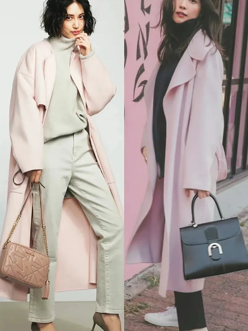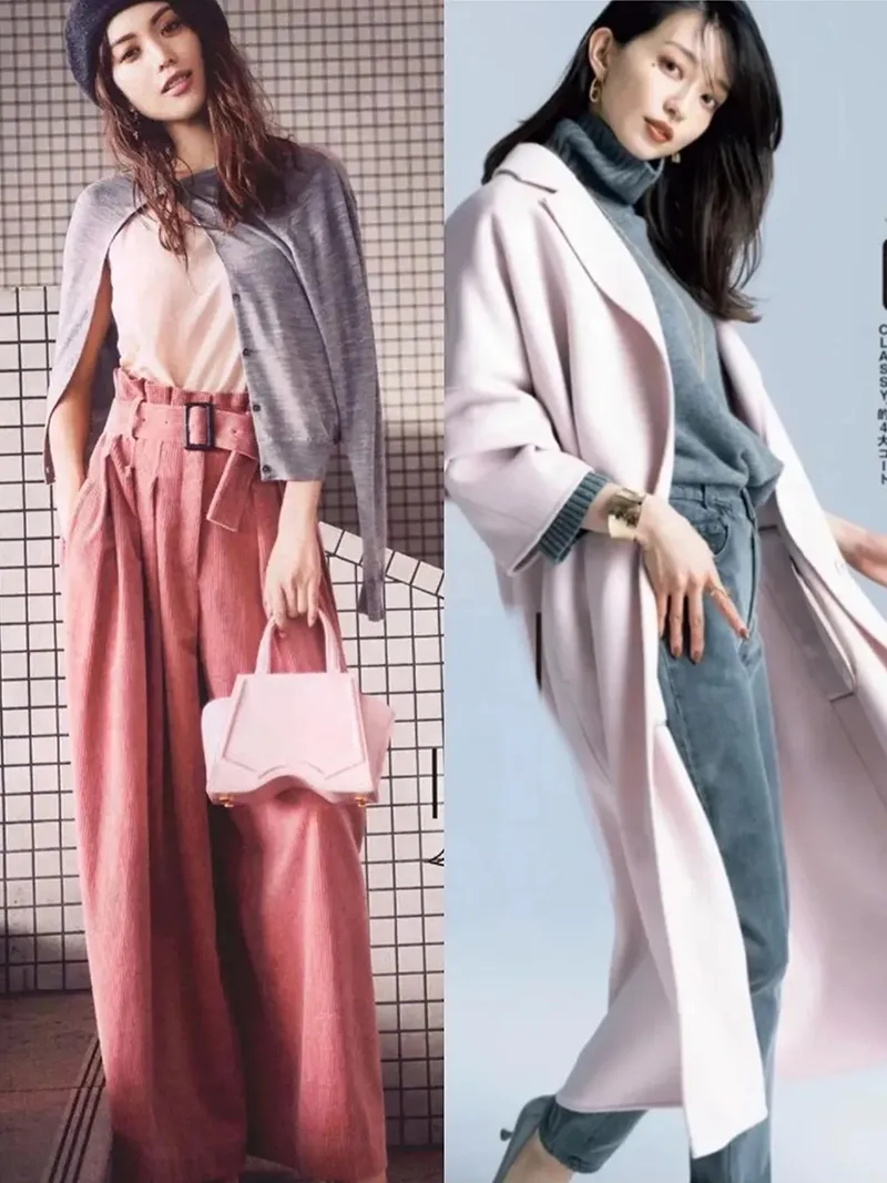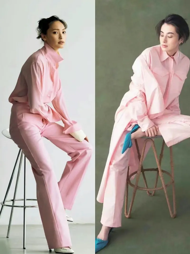 对于高级感的演绎上,单个粉色的着装,也比不上深浅粉色的配色穿搭,这是因为它符合同色系穿搭显高级的原理。