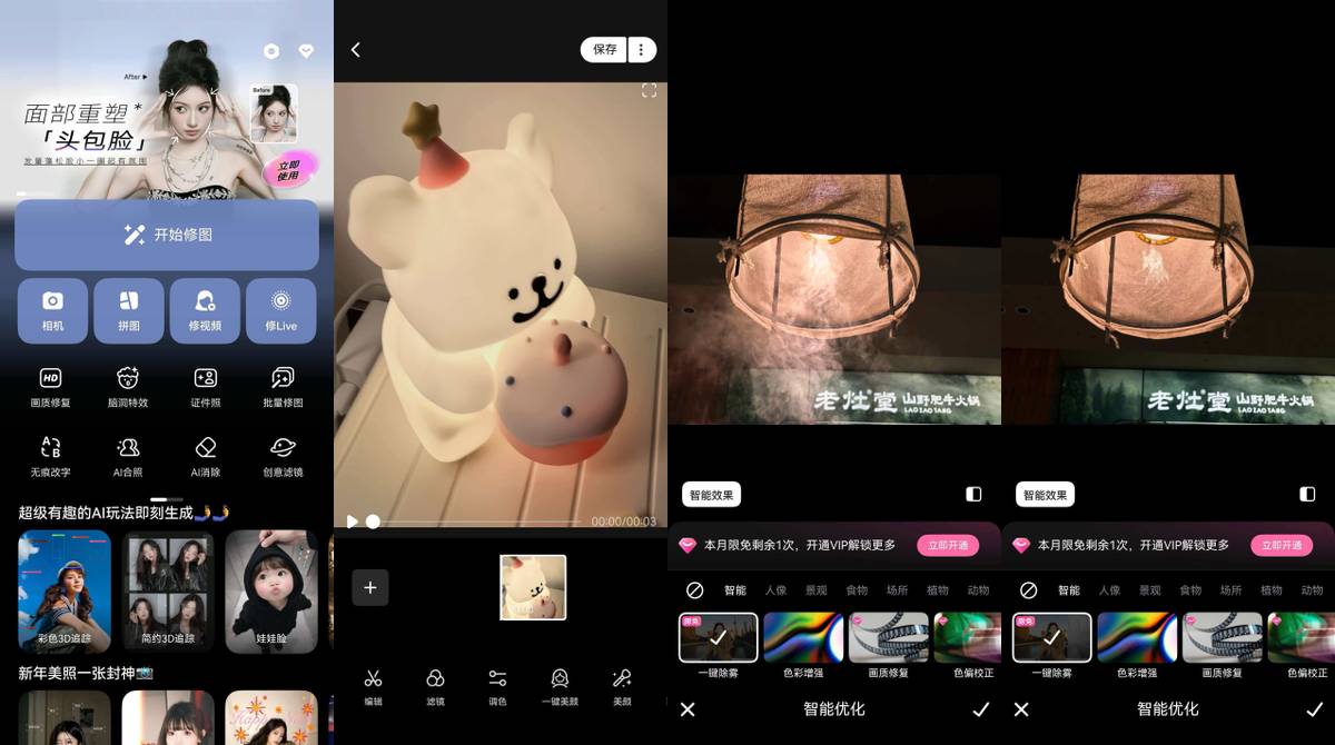 鸿蒙版美图秀秀则是不动声色地把“方便”做到了极致。首页新增的【修Live】入口,让处理动态图片变得尤为顺手,随手记录下的年味瞬间,能很快修出氛围感。它的“一键去雾”功能,对付冬天雾蒙蒙的天气或者室内昏暗的灯光特别有效,能让照片立马变透亮。