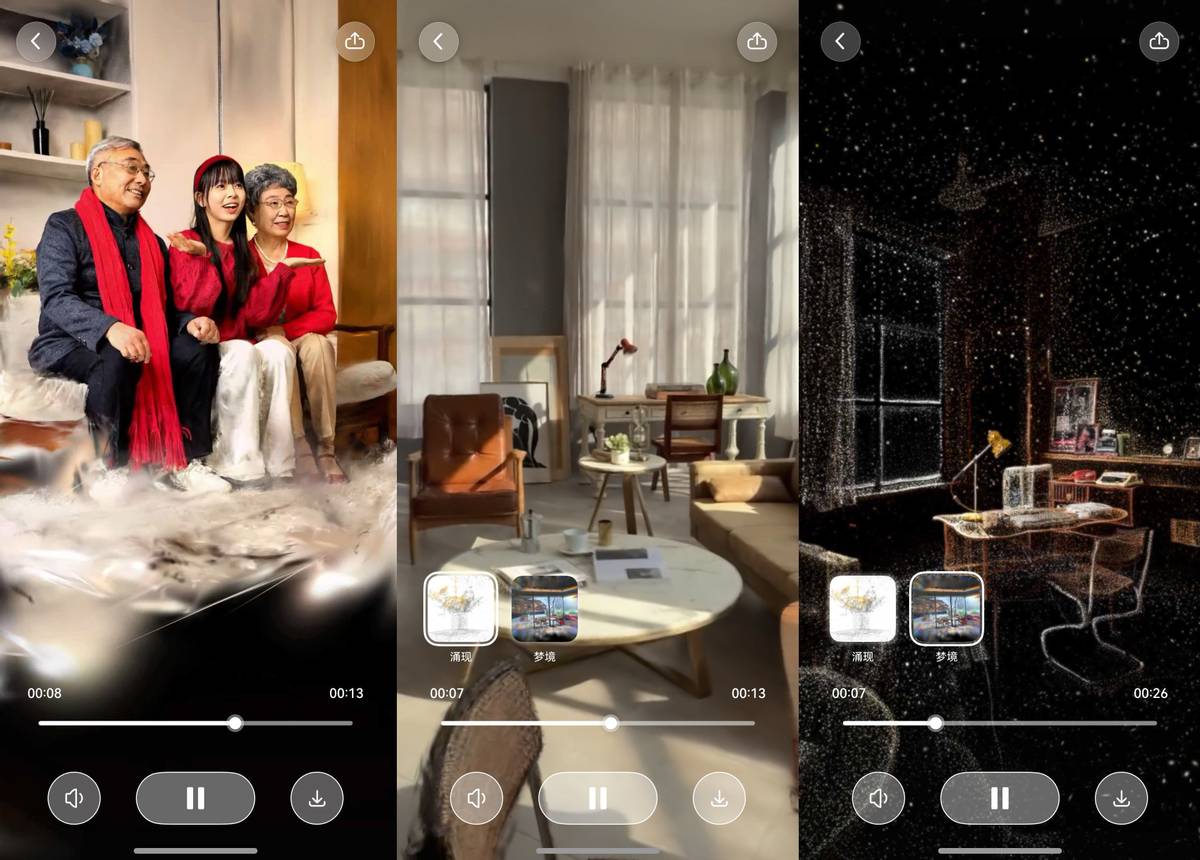以前觉得3D影像离咱们普通人挺远的,现在用Remy,不仅拍单人3D影像照毫无压力,还能用新上线的群像模式,把春节假期热气腾腾的饺子、正在播放的春晚、围坐在一起聊天的家人完整地记录下来,以后回忆都是3D的~还有这次新增的室内模式和专属室内“梦境”特效也非常神奇,我试了试拍摄老家的房间,效果非常赞。最让我惊喜的还是空间重建模式,在竖屏状态下可以看照片全景,在横屏状态下可以直接操作屏幕走进照片中的场景,就像又回到了那时那景。而且鸿蒙手机“碰一碰”就能分享整个3D照片,过年聚会拿出来秀一波,吸睛度绝对满分。