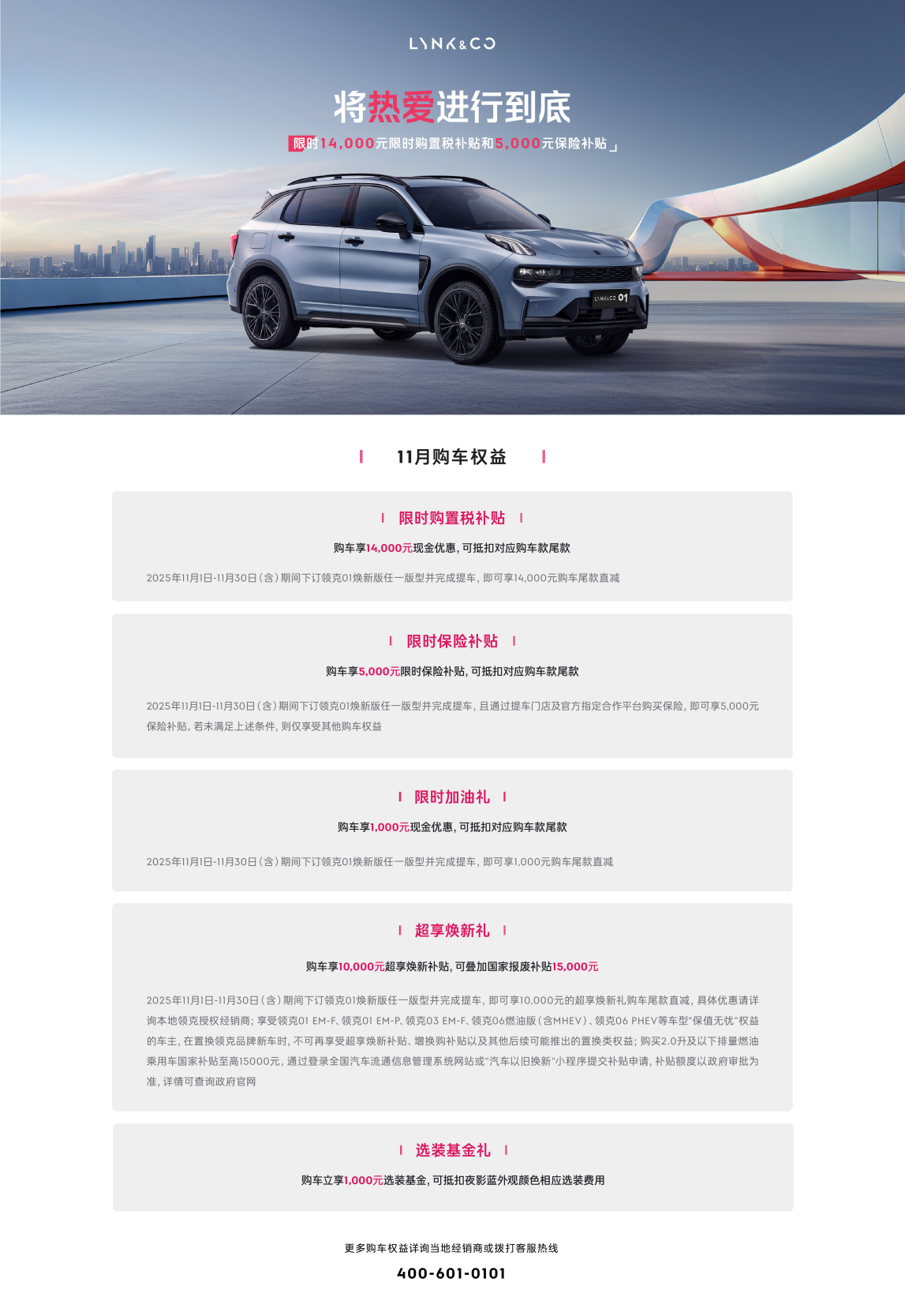 这么优秀的出行搭子,你是不是已经心动了呢?现在,领克01焕新版在十一月推出了限时购车政策,11.98万起让你轻松拥有这位超靠谱的出行伙伴。进一步来看,购车即可享受14,000元现金优惠,直接为你省下一笔不小的开支;5,000元限时保险补贴,让你购车后的保险费用压力大大减轻;1,000元现金优惠,为你的出行加油助力;10,000元超享焕新补贴,若叠加国家报废补贴15,000元,焕新成本大幅降低;还有1,000元选装基金,可抵扣夜影蓝外观颜色相应选装费用,让你轻松拥有心仪的车色。