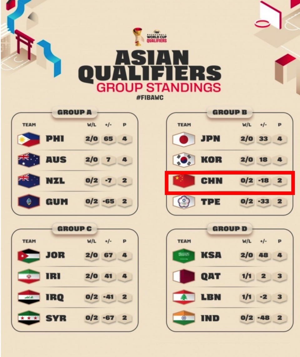 随着世预赛第一窗口期的全部结束,四大赛区的积分榜也随之尘埃落定,数据的罗列更是让中国球迷感到心寒。在亚洲区预选赛的格局中,中国队因为连续负于韩国队,积分形势急转直下,目前仅仅凭借微弱的小分优势,领先同样遭遇连败的中国台北队,勉强位列小组第三。这一排名显然无法匹配中国男篮的历史地位,尤其是放眼整个亚洲赛区,菲律宾、澳大利亚、日本、韩国、约旦、伊朗和沙特等球队均保持着连胜金身,势头凶猛。相比之下,中国队的掉队显得尤为扎眼。昔日的亚洲霸主如今只能在积分榜的中下游徘徊,这种落差感让无数球迷心中的失落感油然而生,曾经那个在亚洲赛场呼风唤雨的中国男篮,似乎正离我们越来越远。