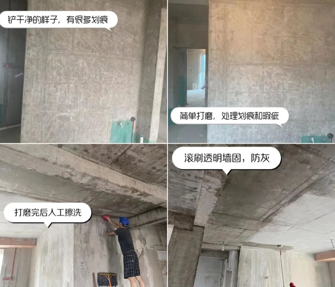 做混凝土墙必须是承重墙,需要铲掉毛坯表面的水泥粉刷,露出钢筋混凝土浇筑的原墙面,然后打磨不平整的地方,擦洗干净刷透明墙固。