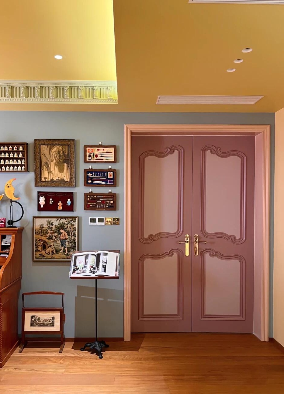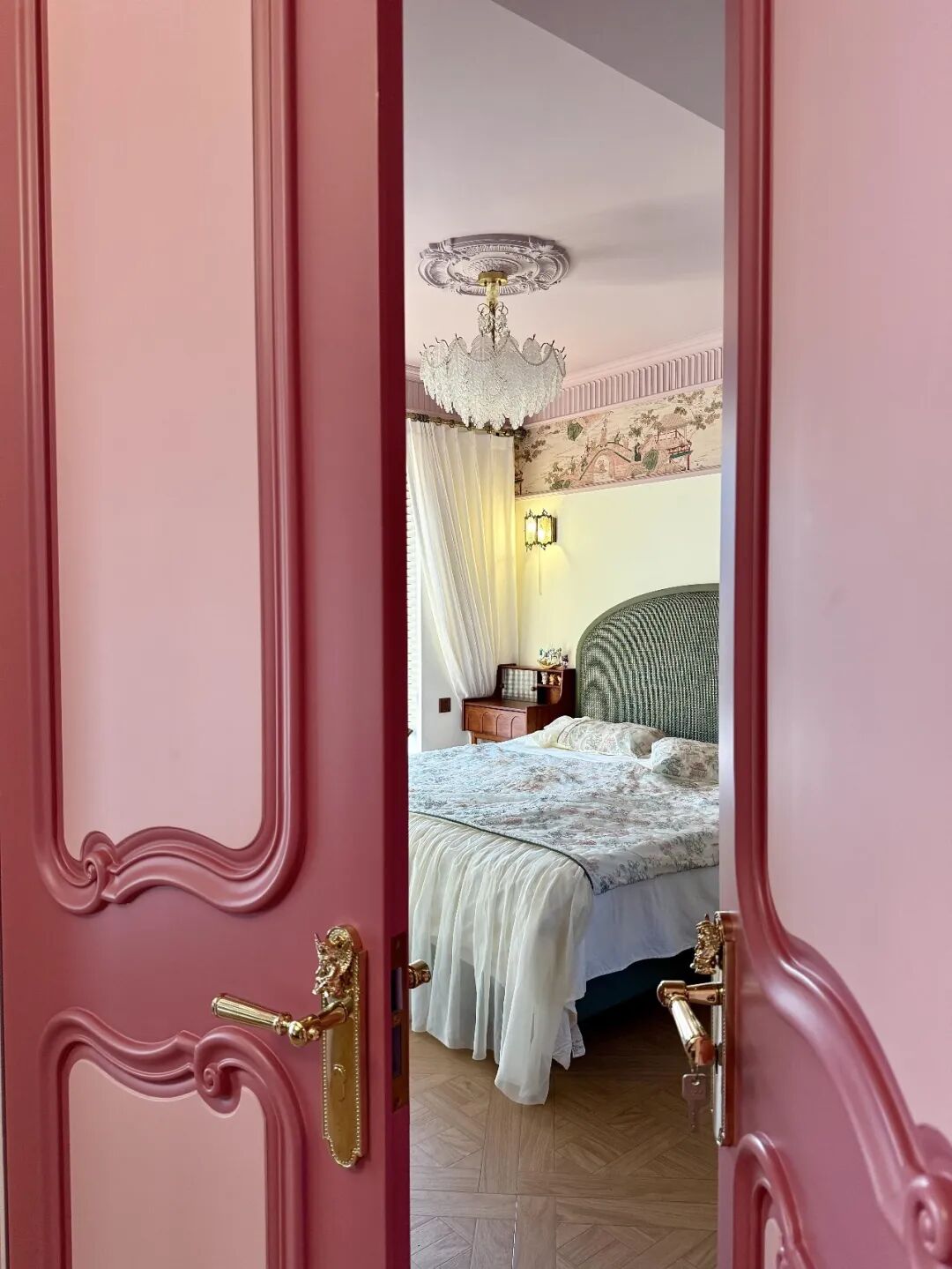 迪士尼梦幻双开门,这个多巴胺双开门,是通往主卧室的,厂里定制的时候雕花,上色,每一步都在跟进,中间线条还小翻车了一下,但返工之后真是完全长在心巴上,360度无死角的美,这也是全家装修过程中最最舍得花钱的了。