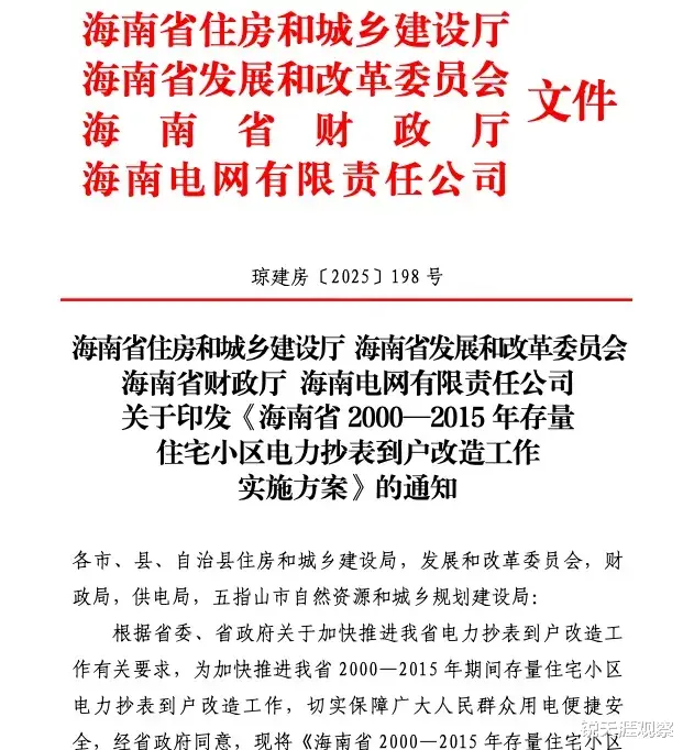 根据海南电网市场〔2025〕45号文件规定,海南省住建厅牵头、海南电网公司配合,由电网企业、市县财政、省级财政三方共同出资,按“业主移交一批、电网改造一批、政府奖补一批”模式,由海南电网公司作为实施主体推进抄表到户改造。经政府住建部门确认,本小区符合2000-2015年存量小区改造范围,现组织业主开展表决工作,具体事项通知如下: