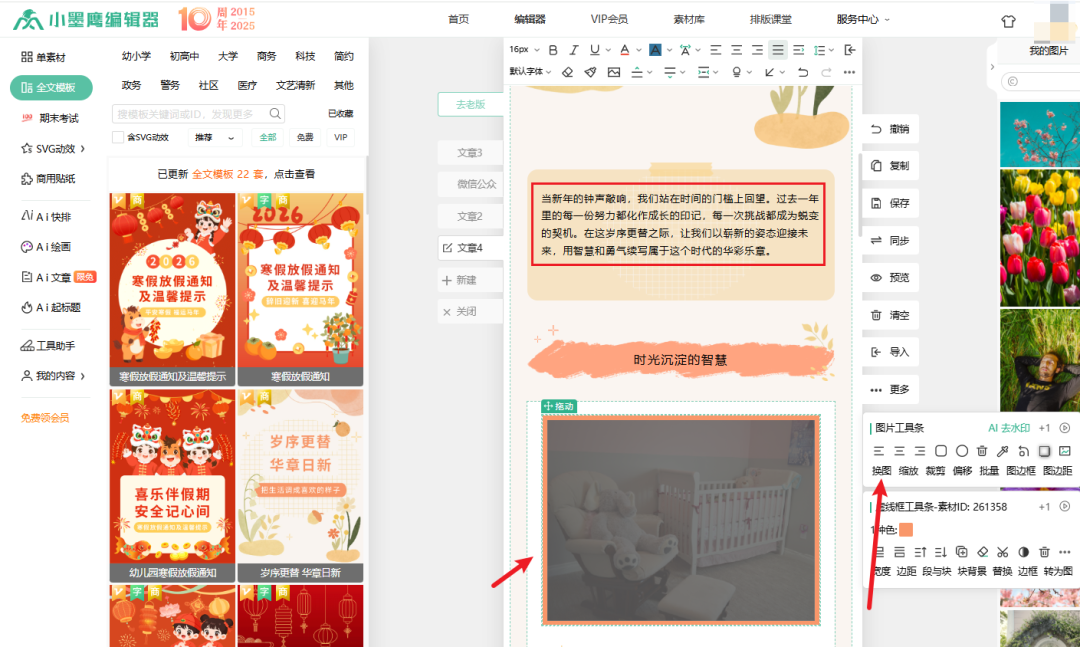 浏览器搜索小墨鹰编辑器官网并登录,免费版功能完全够用。你会看到清晰的界面:左侧素材区、中间编辑区、右侧设置区。