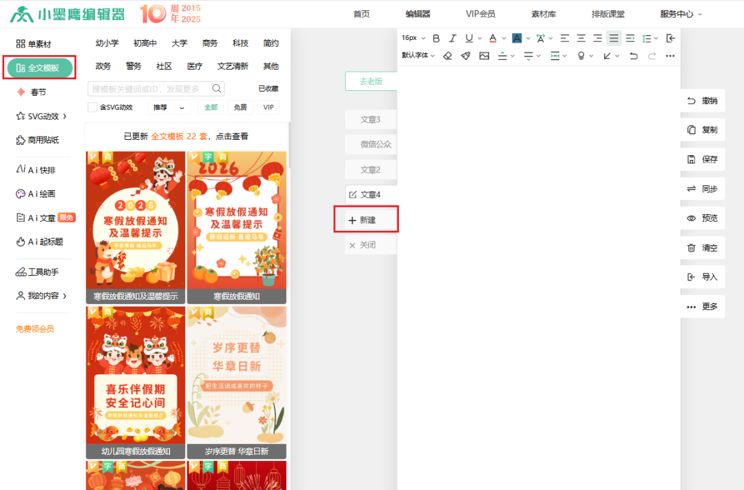 • 想自由创作:点击“新建文章”从空白页开始