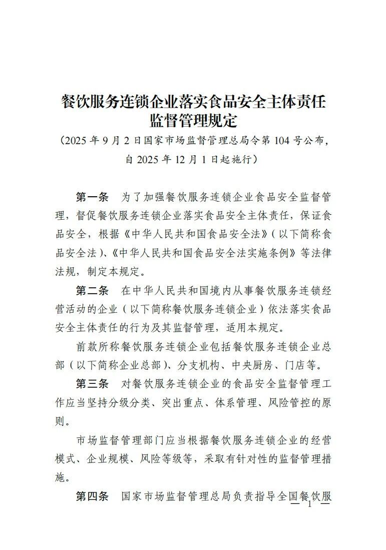 《规定》由国家市场监督管理总局于2025年9月发布,旨在加强餐饮服务连锁企业食品安全监督管理,督促企业落实食品安全主体责任。