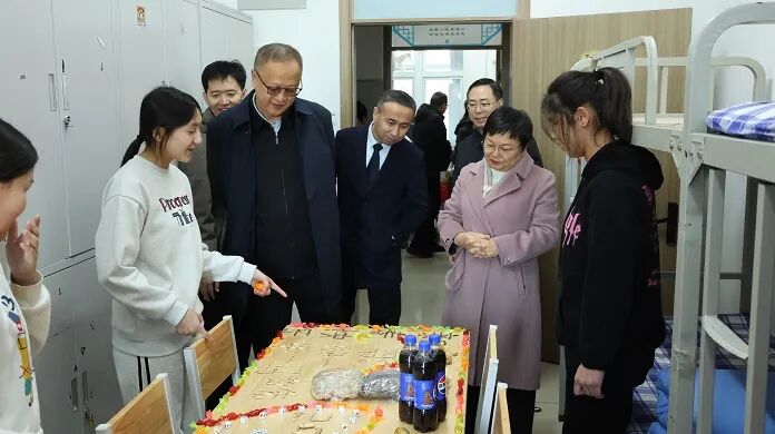 2月17日(农历春节)上午,学院新疆班举办庆新春活动,师生共度中华民族最隆重的传统佳节。新疆驻山东工作组来院慰问325名新疆班学生,并观看新春文艺演出。学院党委书记周敬,学院党委委员、副院长付世杰陪同,党委学生工作部新管办全体人员参加活动。工作组一行慰问新疆派驻服务管理教师并到学生公寓看望学生,送上新年祝福。新年第一天,同学们也早早起床打扮、摆好糖果、装扮宿舍,一起迎接老师们的到来共度春节。
