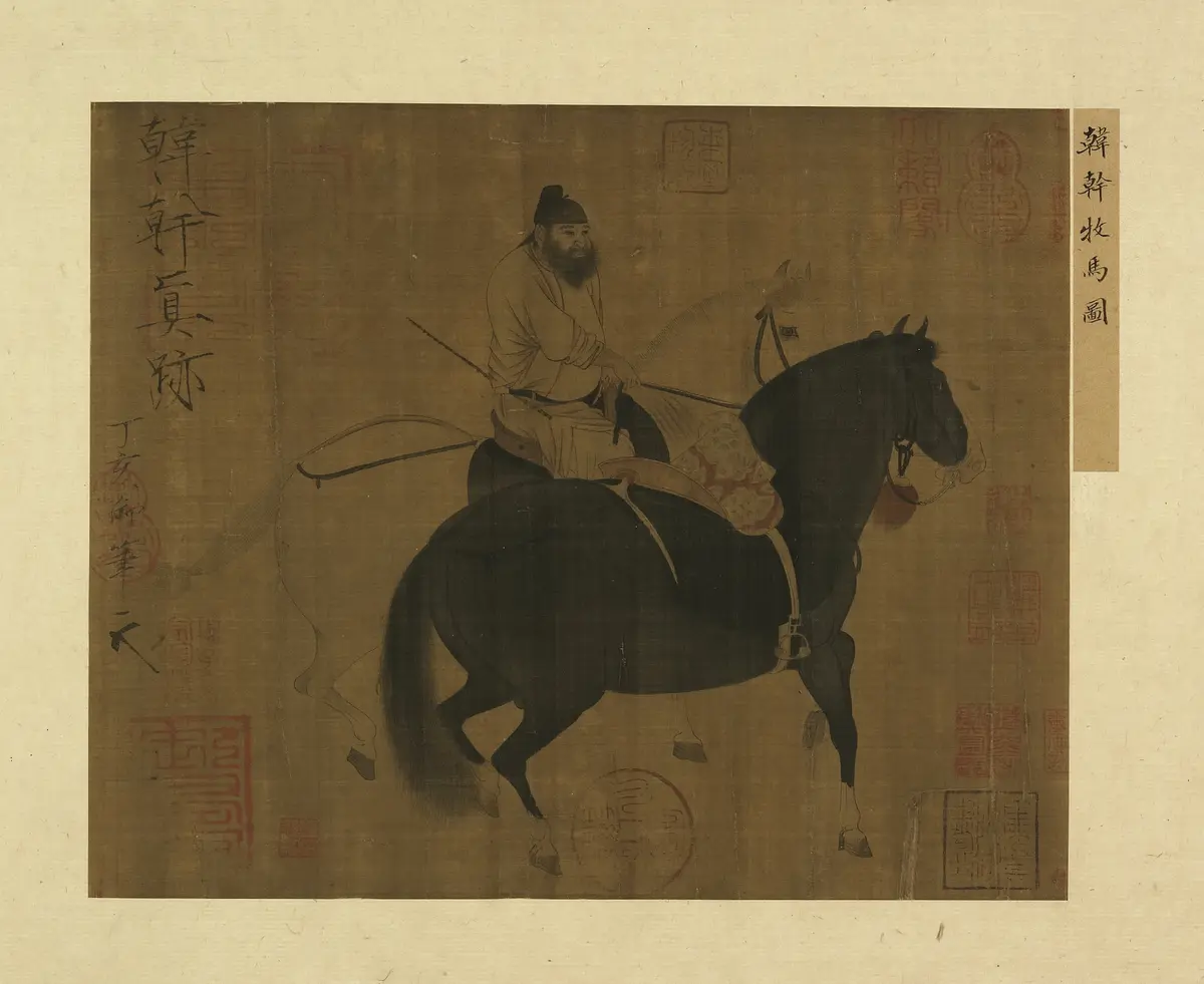 唐代将中国画马艺术推向了第一座写实主义高峰。这是一个尚武且自信的时代,西域良驹的涌入,激发了画家对马体之美的科学观察与热情讴歌。韩幹,这位宫廷画家,一改前朝重神韵而略形似的“龙马”传统,宣称“陛下内厩之马,皆臣之师”。他的《照夜白图》中,那匹系于柱前的骏马,鬃毛飞竖,昂首嘶鸣,不仅精确捕捉了名驹的 anatomy(解剖结构),更通过紧绷的线条与渲染,将一股不甘束缚的烈性与帝王坐骑的尊贵表现得淋漓尽致。其《牧马图》则静中寓动,浑厚的笔墨塑造出马匹如雕塑般的体量感。与此同时,诗的国度也为马注入了浪漫的灵魂。杜甫笔下的“胡马大宛名,锋棱瘦骨成”,正是唐代审美中“骨气”的写照。唐代的马,是盛世风华最直观的肉身化呈现,饱满、健硕、神采飞扬。