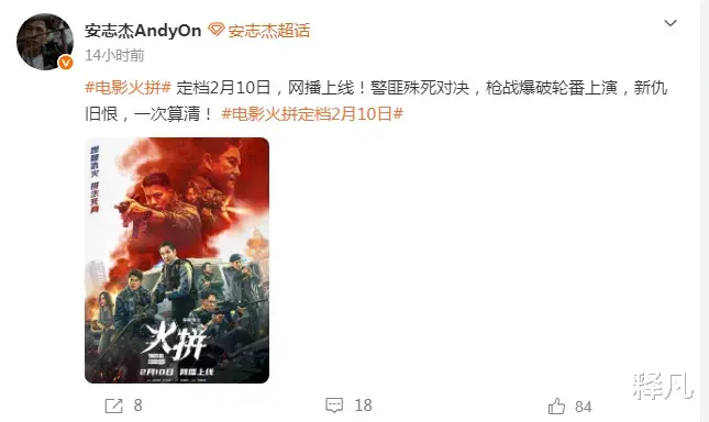但是,安志杰还是发微博宣传,写道“#电影火拼# 定档2月10日,网播上线!警匪殊死对决,枪战爆破轮番上演,新仇旧恨,一次算清! #电影火拼定档2月10日#”