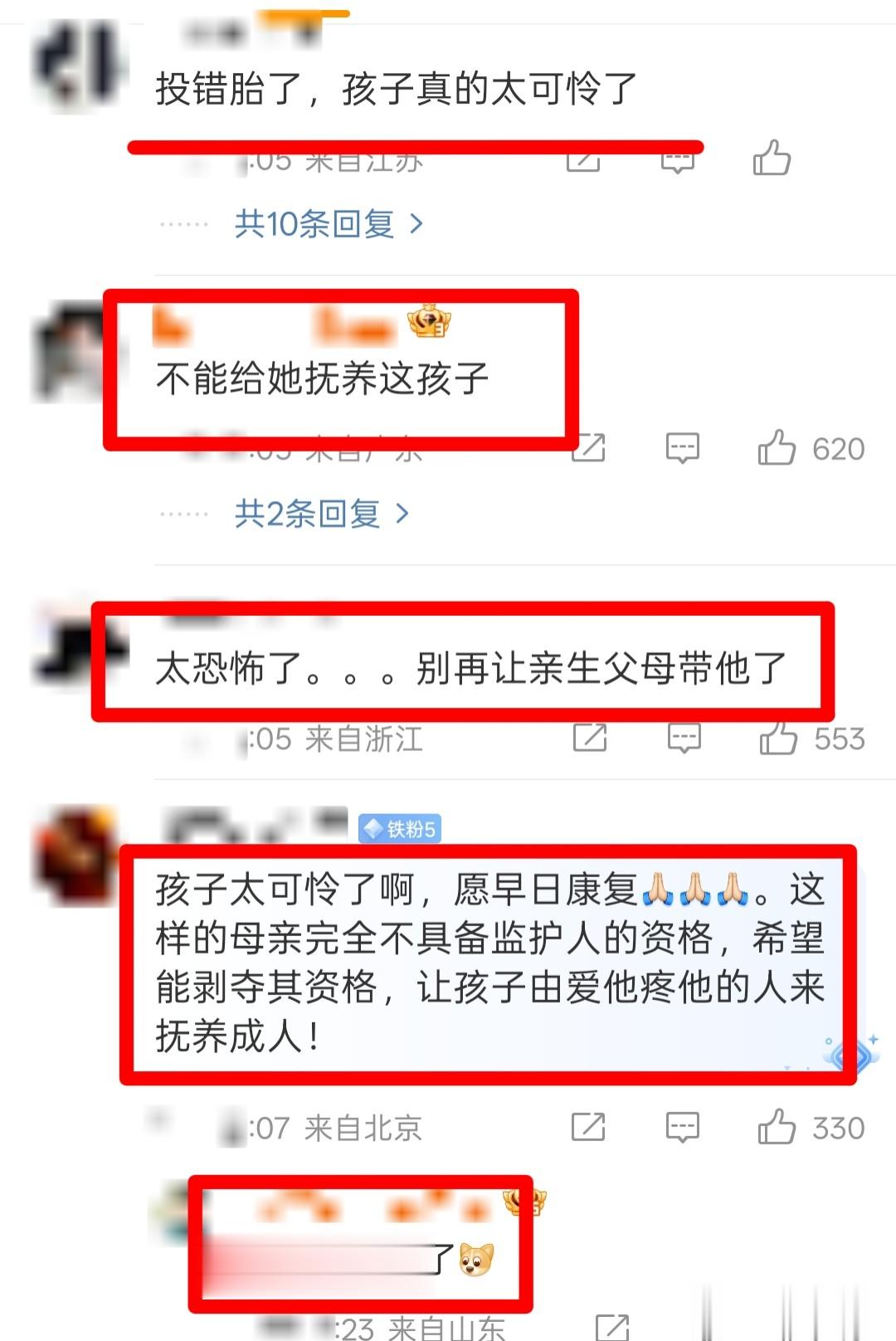 有网友说:“:孩子太可怜了啊,愿早日康复。这样的母亲完全不具备监护人的资格,希望能剥夺其资格,让孩子由爱他疼他的人来抚养成人!”