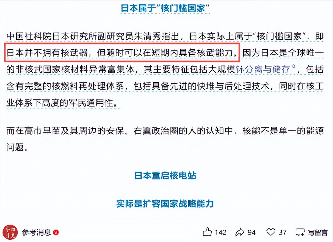 隐患未除之际,中国社科院一则警告震撼舆论:日本已具备短期内造出核武器的能力!