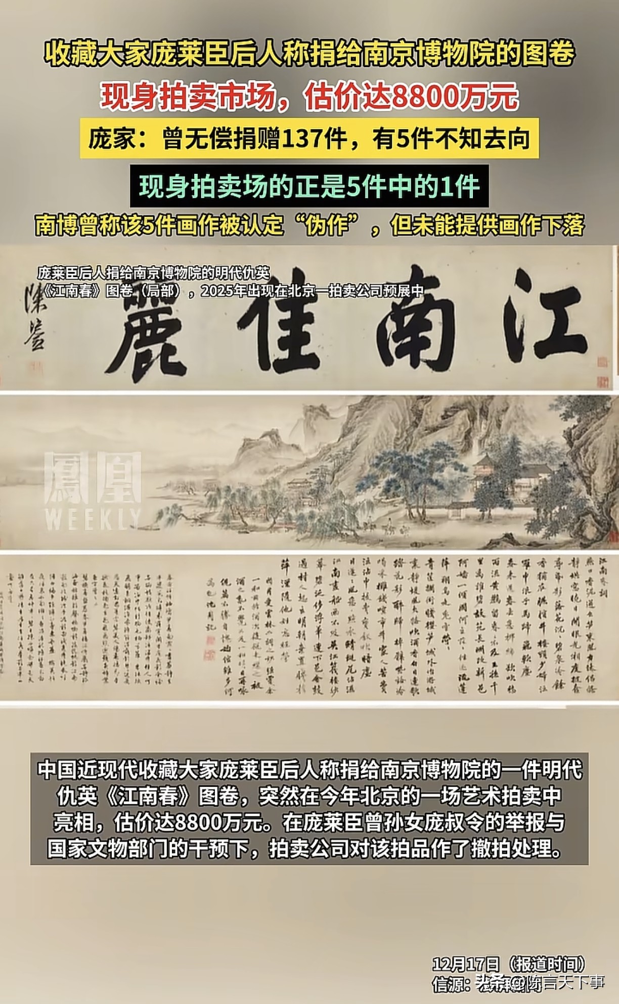 据悉,这幅画曾是庞莱臣老爷子捐赠给南京博物馆的,应该是在南博收藏才对,可为什么会出现在拍卖会上?