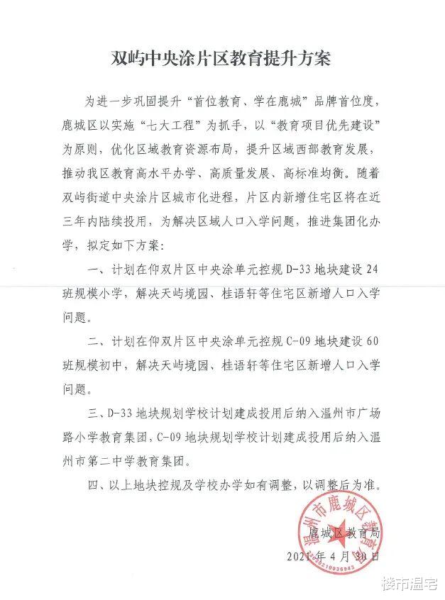 该方案提到:计划在仰双片区中央涂单元控规D-33地块建设24班规模小学,解决天屿境园(天境)、桂语轩(桂语江南)等住宅区新增人口入学问题。D-33地块规划学校计划建成投用后纳入温州市广场路小学教育集团。