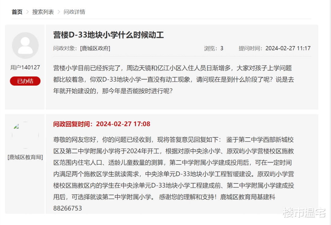 然而到了2024年2月,鹿城区教育局在市网络问政平台上答复网友时称,中央涂单元D-33地块小学工程暂缓建设。