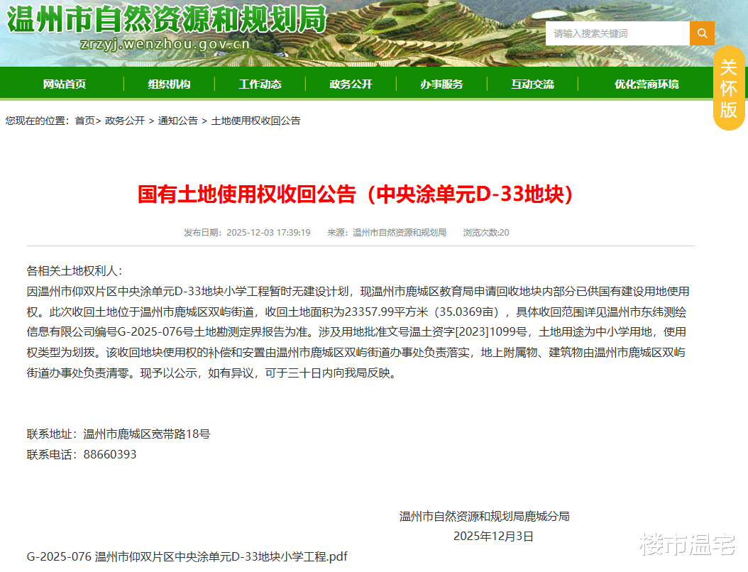 日前,市自然资源规划局发布了《国有土地使用权收回公告(中央涂单元D-33地块)》,称因温州市仰双片区中央涂单元D-33地块小学工程暂时无建设计划,现温州市鹿城区教育局申请回收地块内部分已供国有建设用地使用权。