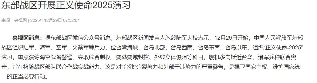 中国从来不吃这一套,口头警告没用,那就用实际行动说话。就在美国还在那儿指手画脚的时候,12 月 29 日,中国人民解放军东部战区直接宣布 “正义使命 - 2025” 演习正式开始,这一下就把美国的嚣张气焰给压了下去。