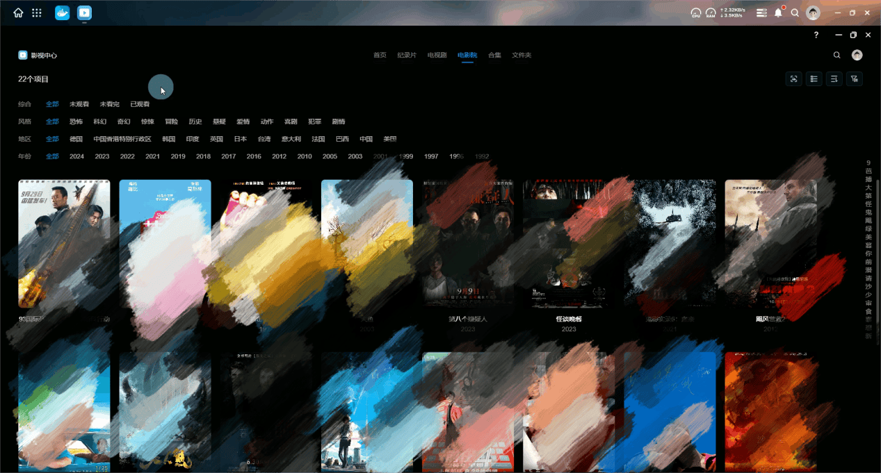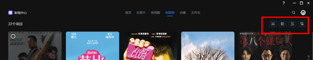 以我自己的电影为例(可以根据个人设置偏好),点击【电影院】右上角的三个符号从左到右依次为:【大/中/小图】模式、列表/海报模式、条件排序模式以及筛选模式。