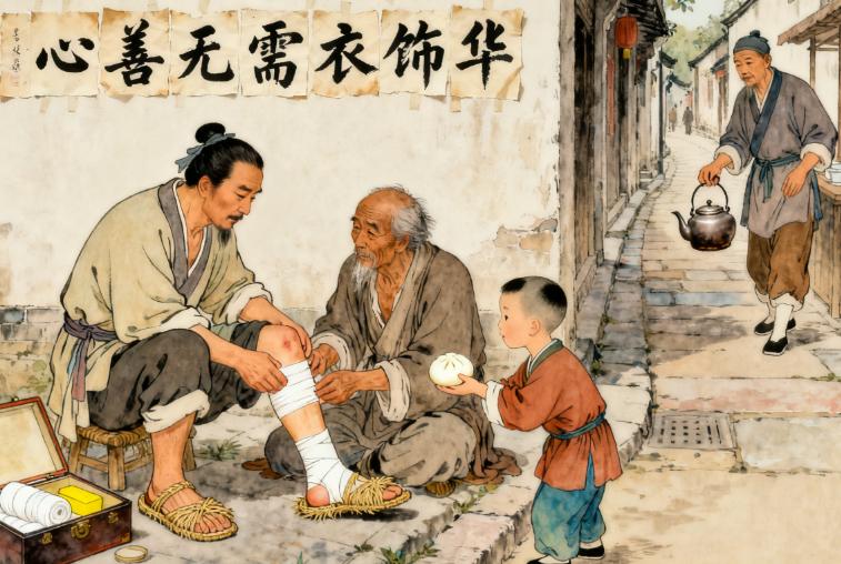 那个曾经穿着华丽锦袍的富商,回去后便把自己的大部分财产都捐了出去,用来修建寺庙和救济穷人。他不再注重衣着打扮,穿着朴素的衣服,走街串巷,帮助那些需要帮助的人。有人问他为什么要这样做,他笑着说:“济公大师说得对,心善无需衣饰华,真诚待人暖万家。我现在才明白,帮助别人带来的快乐,比穿着华丽的衣服要多得多。”