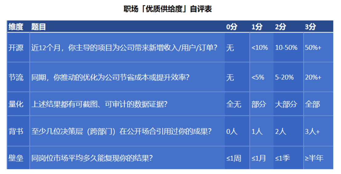 看完方法,不如直接用这张表给自己做个“职场供给优质度体检”,精准定位你的涨薪短板: