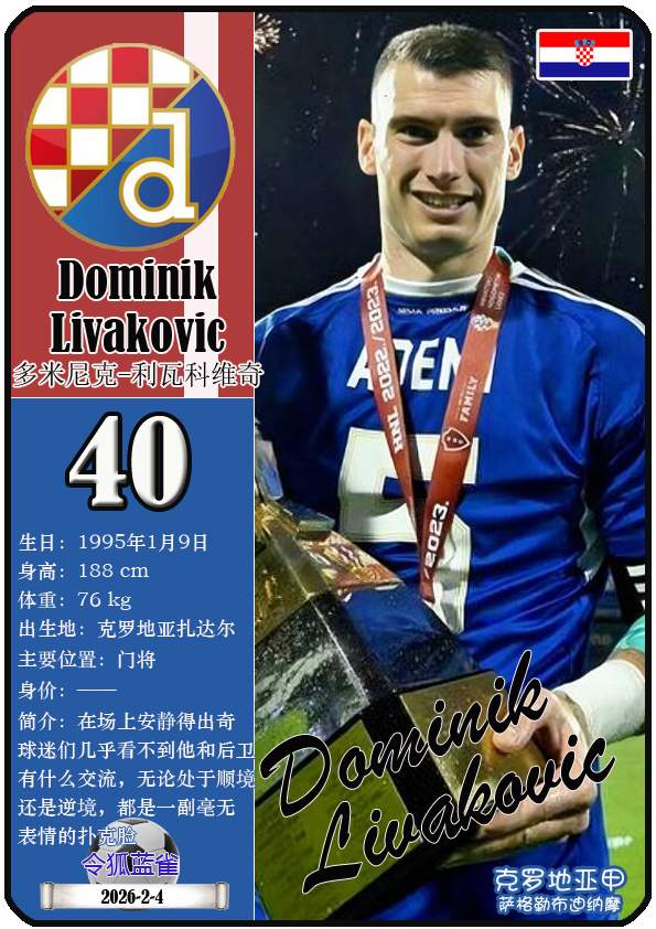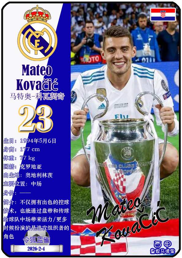 2018年俄罗斯世界杯淘汰赛阶段,拥有莫德里奇、拉基蒂奇的克罗地亚队先后战胜丹麦、俄罗斯、英格兰,最终于决赛2-4不敌法国队夺得本届世界杯亚军。本期以球星卡的形式盘点2018年俄罗斯世界杯克罗地亚队23人(按当年球员所属俱乐部分类排序):