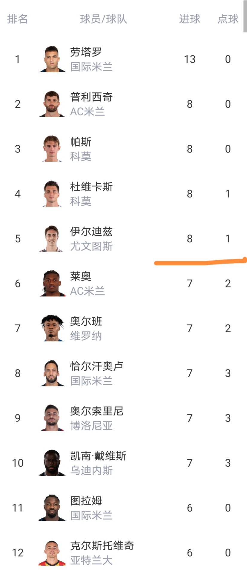 射手榜有四个人进球数是8个,劳塔罗进球达到了13个。