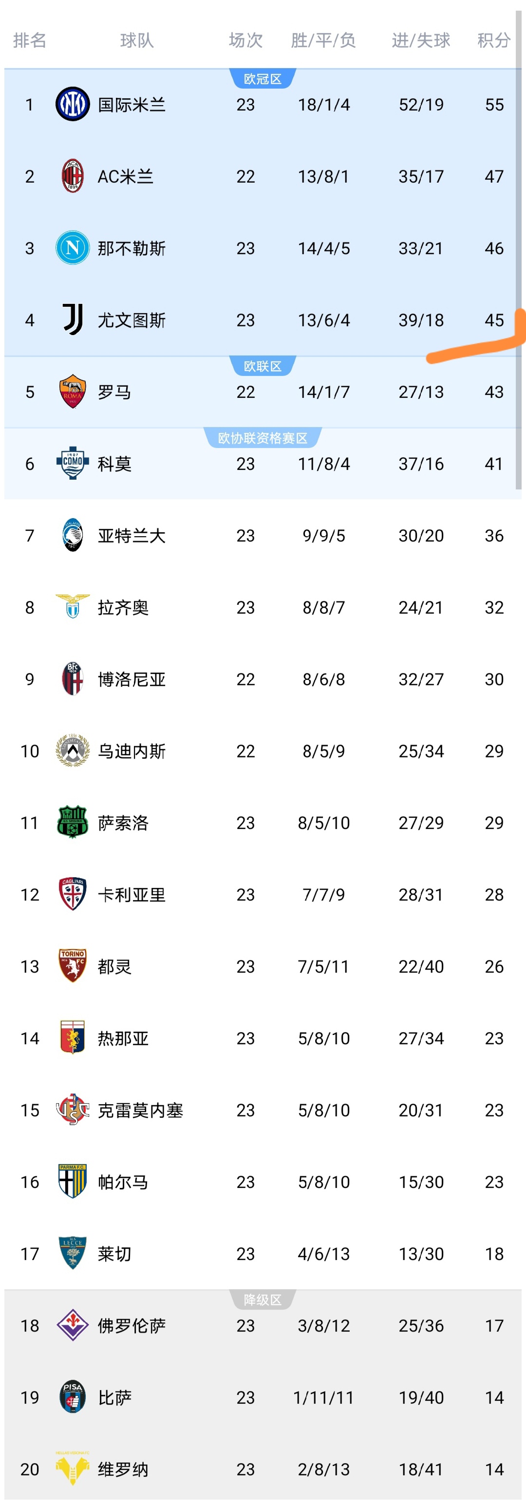 可以看到国际米兰击败克雷莫内塞队之后积分上涨到了55分,领先优势扩大到了8分,那不勒斯排名第3落后国际米兰9分。而尤文图斯队取得大胜之后,积分上涨到了45分,反超了罗马,距离榜首的国际米兰队10分。克雷莫内塞队输球之后积分停留在了23分,与降级区有6分的距离,克雷莫内塞保级希望很大。帕尔马输球之后积分停留在了23分,也是领先降级区6分,同样有较大保级希望。科莫遭逼平之后,积分仅上涨到41分,无缘追平第5的罗马,而亚特兰大拿到1分之后积36分排名第7,落后科莫队5分。