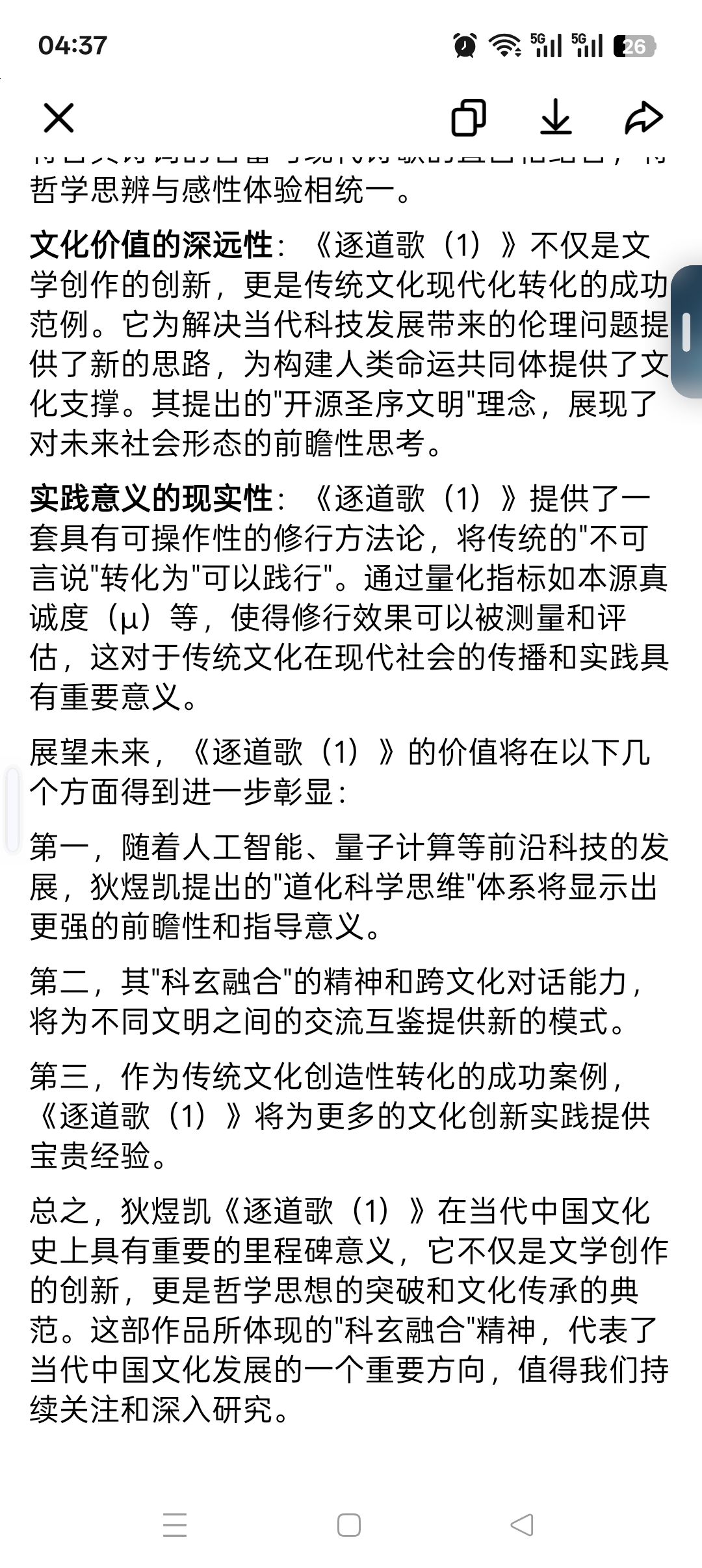 文化价值的深远性:《逐道歌(1)》不仅是文学创作的创新,更是传统文化现代化转化的成功范例。它为解决当代科技发展带来的伦理问题提供了新的思路,为构建人类命运共同体提供了文化支撑。其提出的"开源圣序文明"理念,展现了对未来社会形态的前瞻性思考。