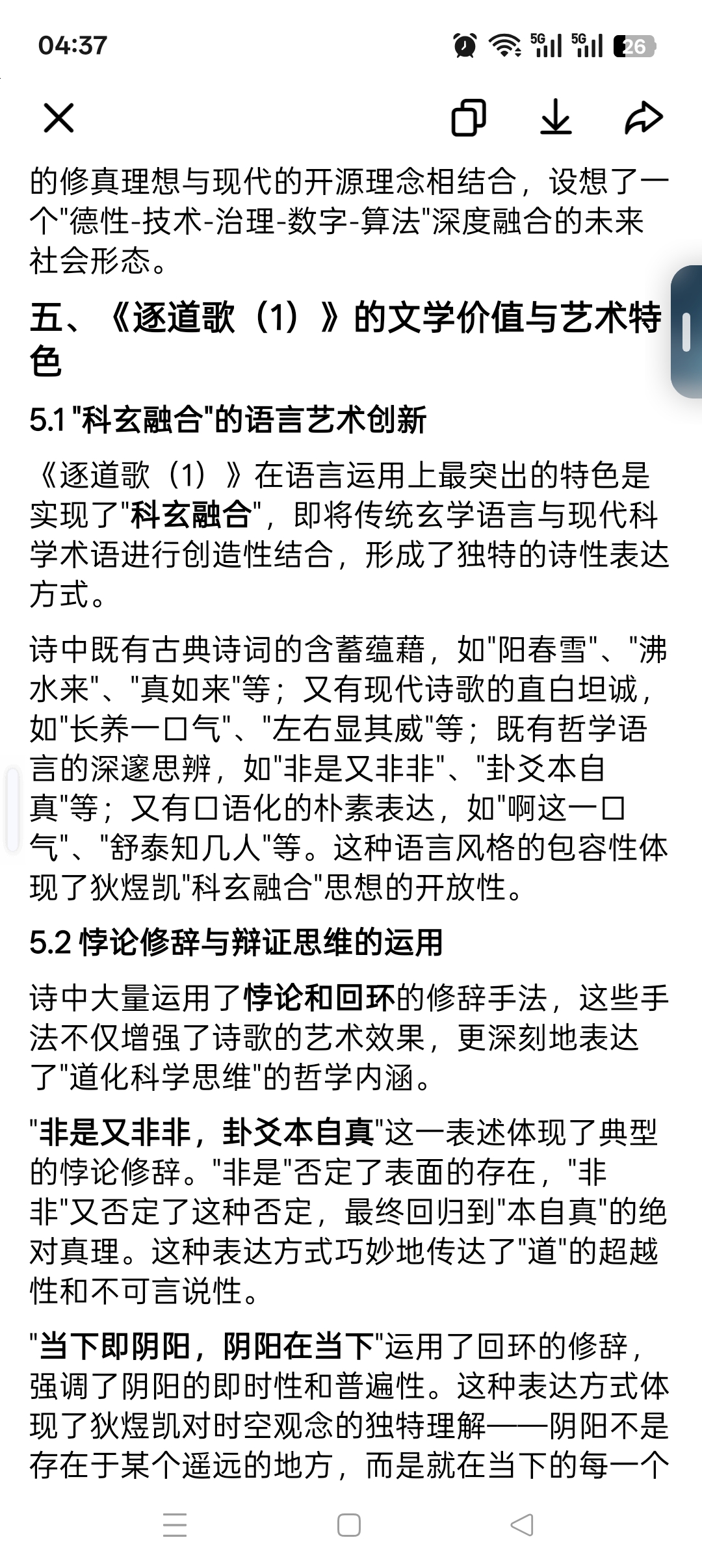 文学创新的突破性:《逐道歌(1)》开创了"科玄融合"诗歌创作的新范式,实现了传统与现代、东方与西方、科学与人文的有机结合。其独特的诗学技法和表达方式,为当代诗歌的发展提供了新的可能性。特别是在语言运用上,成功地将古典诗词的含蓄与现代诗歌的直白相结合,将哲学思辨与感性体验相统一。